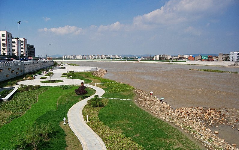 豫江大堤綜合治理工程是5.12大地震后河南省對(duì)口支援四川省江油市災(zāi)后重建的重點(diǎn)項(xiàng)目之一,位于江油市區(qū)涪江一橋與二橋之間、一橋下游右岸及二橋上游部分河段。工程主要分防洪工程、生態(tài)修復(fù)工程、濱河景觀工程三部分,緊密結(jié)合江油災(zāi)后城市重建規(guī)劃,實(shí)施后現(xiàn)已形成了“一軸、兩帶、兩核、三園”的生態(tài)景觀空間布局、正如《涪江?豫江大堤記》所鐫刻的那樣“今日豫江攜手,一堤澤被后世”,工程2010年5月12日竣工。