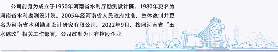 公司前身可追溯至1950年成立的河南省治淮總指揮部計(jì)劃處,1956年與河南省水利廳勘測(cè)設(shè)計(jì)處合并成立了河南省水利廳勘測(cè)設(shè)計(jì)院,1980年更名為河南省水利勘測(cè)設(shè)計(jì)院。2005年經(jīng)省人民政府批準(zhǔn),整體改制為科技型企業(yè),并更名河南省水利勘測(cè)設(shè)計(jì)研究有限公司。2022年9月,根據(jù)河南省委、省人民政府“五水綜改”相關(guān)工作部署,公司積極推進(jìn)股權(quán)重組,由河南水利投資集團(tuán)有限公司控股51%,公司改制為國(guó)有控股企業(yè)。