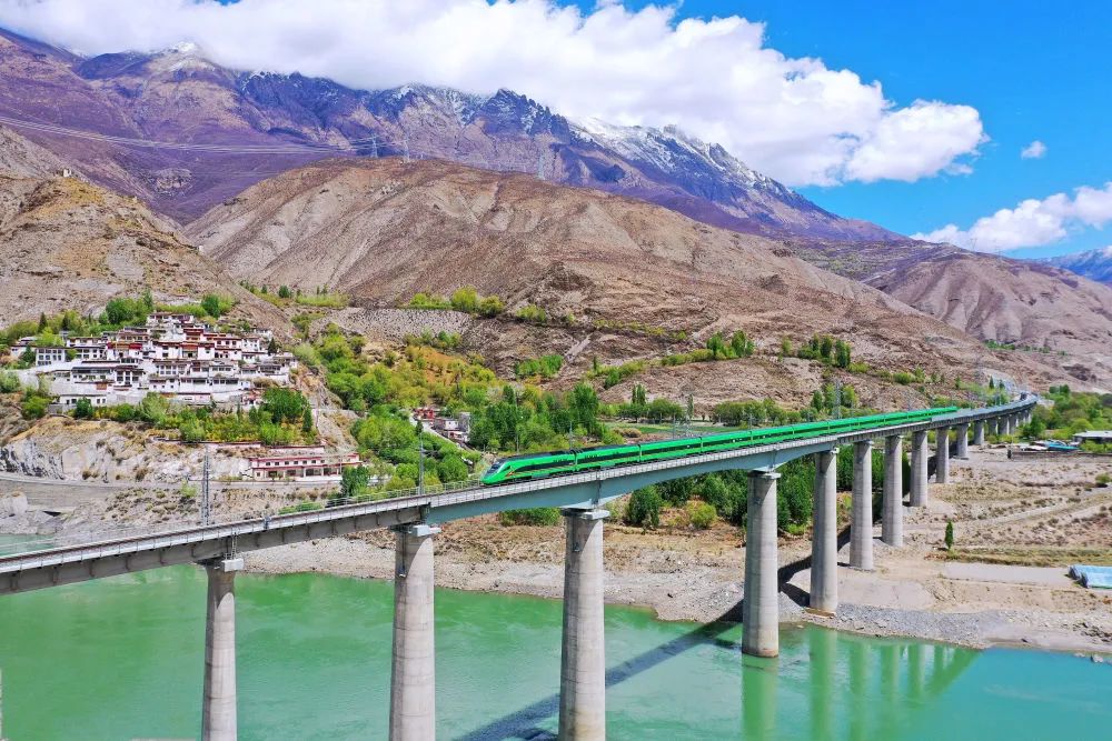 復(fù)興號(hào)列車行駛在西藏朗縣境內(nèi)(2022年4月14日攝)。新華社記者 覺果 攝