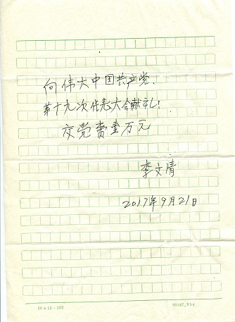 李文清同志,女,1929年5月出生,1952年參加工作以來(lái),不論在什么工作單位和工作崗位,始終勤勤懇懇。任勞任怨,干一行愛(ài)一行,干好一行,多次被評(píng)為先進(jìn)工作者。 1980年8月到河南省水利勘測(cè)設(shè)計(jì)院任會(huì)計(jì),她認(rèn)真負(fù)責(zé),待人熱情,服務(wù)周到,受到同事的好評(píng)。她積極要求進(jìn)步,1956年就向黨組織遞交了入黨申請(qǐng)書(shū),幾十年矢志不渝,1990年12月退休后,她堅(jiān)持理想信念,孜孜不倦的追求,于1995年3月光榮入黨。入黨后,她始終在政治上同黨中央保持高度一致,堅(jiān)信只有中國(guó)共產(chǎn)黨才能帶領(lǐng)全國(guó)各族人民走中國(guó)特色社會(huì)主義道路,實(shí)現(xiàn)全面小康和國(guó)家富強(qiáng)。她關(guān)心國(guó)家大事,關(guān)心單位發(fā)展,深感為黨工作太少,為了表達(dá)對(duì)黨的深厚感情,2011年“七一”前夕,為慶祝建黨90周年,一次性向組織交納黨費(fèi)9999元;2016年6月16日,她用樸實(shí)無(wú)華的語(yǔ)言給黨組織寫(xiě)了“我要給偉大的中國(guó)共產(chǎn)黨過(guò)生日”,向組織繳納黨費(fèi)2000元;2017年9月22日,在黨的十九大即將召開(kāi)之際,88歲高齡的她平時(shí)省吃?xún)€用,又一次從每月3000多元的退休金里積攢了10000元作為特殊黨費(fèi),向黨的十九大獻(xiàn)上自己的一份厚禮,祝賀黨的十九大勝利召開(kāi),祝愿我們的黨在以習(xí)近平同志為核心的黨中央集體領(lǐng)導(dǎo)下,實(shí)現(xiàn)兩個(gè)一百年的宏偉目標(biāo),實(shí)現(xiàn)偉大的中國(guó)夢(mèng)。