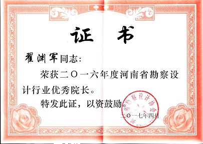 為樹立典型,表彰先進,進一步調(diào)動河南省全行業(yè)勘察設計人員的積極性,促進行業(yè)健康發(fā)展,河南省勘察設計協(xié)會開展行業(yè)突出貢獻、行業(yè)優(yōu)秀企業(yè)和行業(yè)優(yōu)秀院長的評選。我公司被河南省勘察設計協(xié)會評為“2016年度河南省勘察設計行業(yè)突出貢獻獎企業(yè)”,翟淵軍董事長再次榮獲“2016年度河南省勘察設計行業(yè)優(yōu)秀院長”。
