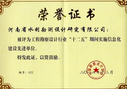 “十二五”期間,我公司以信息化為企業(yè)發(fā)展的重要原動力,先后在綜合信息平臺建設(shè)、三維協(xié)同設(shè)計平臺建設(shè)、水利信息化業(yè)務(wù)拓展等方面取得了長足的發(fā)展,公司管理水平、規(guī)劃設(shè)計產(chǎn)品質(zhì)量、公司業(yè)務(wù)拓展等實現(xiàn)了跨越式發(fā)展,得到了業(yè)內(nèi)的認可,被中國勘察設(shè)計協(xié)會評為工程勘察設(shè)計行業(yè)“十二五”期間實施信息化建設(shè)“先進單位”!數(shù)字工程中心主任高英獲得 “先進個人”榮譽稱號!