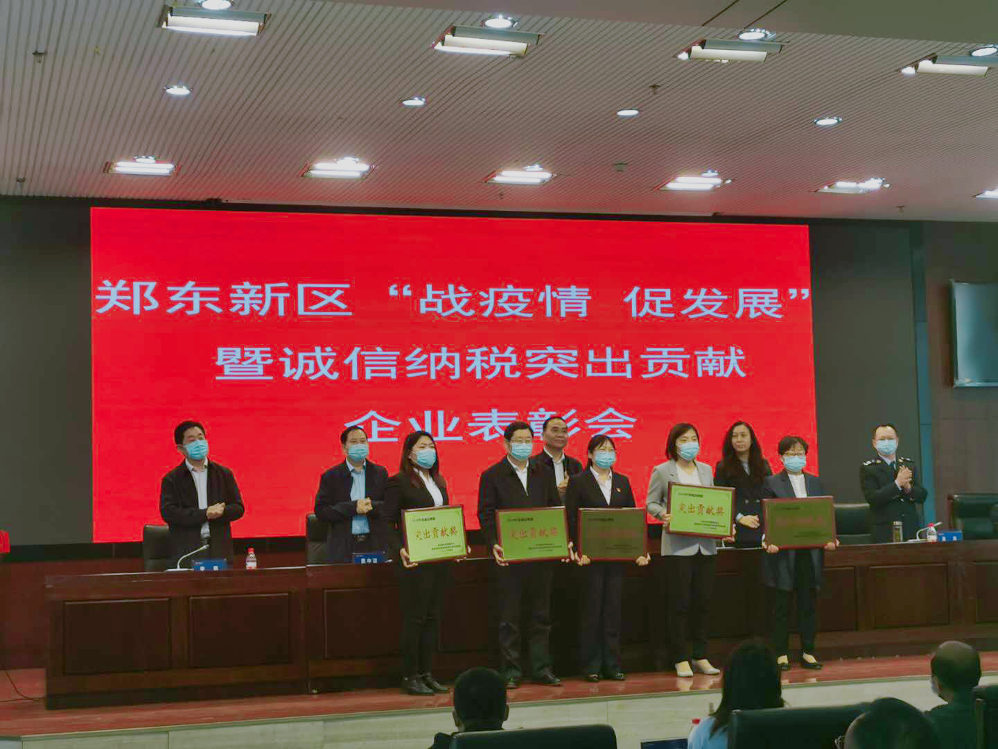 鄭東新區(qū)管委會主任周軍營和鄭東新區(qū)稅務(wù)局局長賈中誼參加會議并頒獎。集團公司翟淵軍董事長參加了頒獎儀式,財務(wù)資產(chǎn)部馮海霞部長列席。
