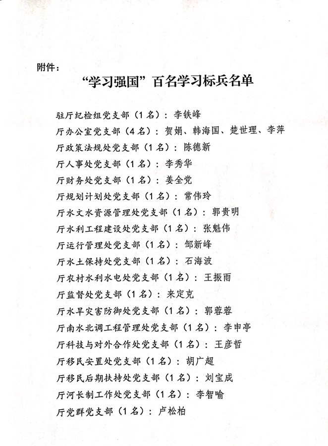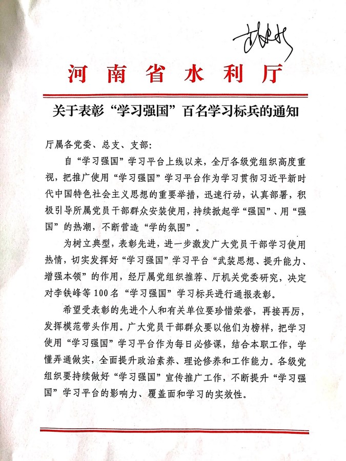 倡議全體黨員向標(biāo)兵學(xué)習(xí),積極主動(dòng)用好“學(xué)習(xí)強(qiáng)國(guó)”平臺(tái),以此為抓手,不斷用習(xí)近平總書(shū)記治國(guó)理政方略武裝頭腦,并學(xué)以致用,將所學(xué)用到我們的工作實(shí)踐,指導(dǎo)我們努力工作、奮勇開(kāi)拓,為新時(shí)代水利改革發(fā)展作出更大的貢獻(xiàn)。