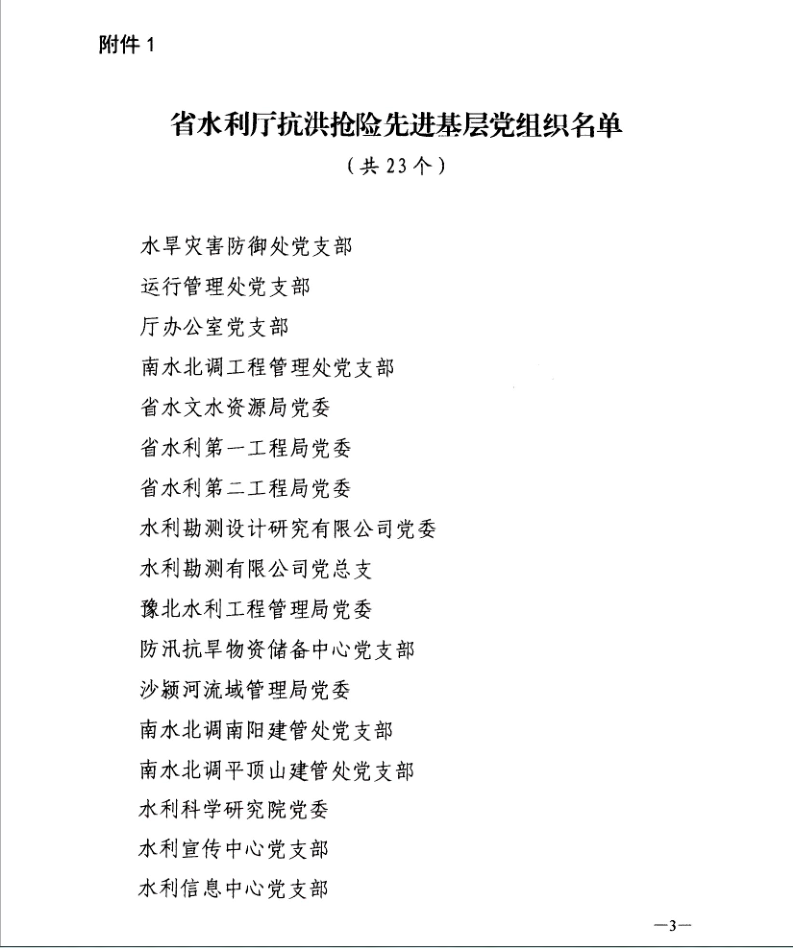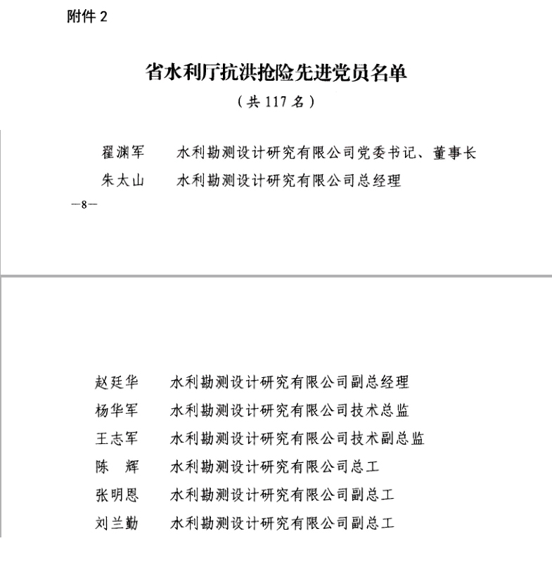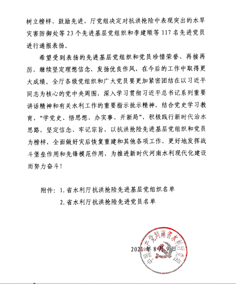8月9日,省水利廳黨組以豫水組【2021】60號文下發(fā)了《關(guān)于對在抗洪搶險中表現(xiàn)突出的先進(jìn)基層黨組織和黨員進(jìn)行表彰的決定》,公司黨委作為省水利廳抗洪搶險先進(jìn)基層黨組織,翟淵軍、朱太山、趙廷華、楊華軍、王志軍、陳輝、張明恩、劉蘭勤等8名黨員同志作為省水利廳抗洪搶險先進(jìn)黨員受到通報表揚(yáng)。