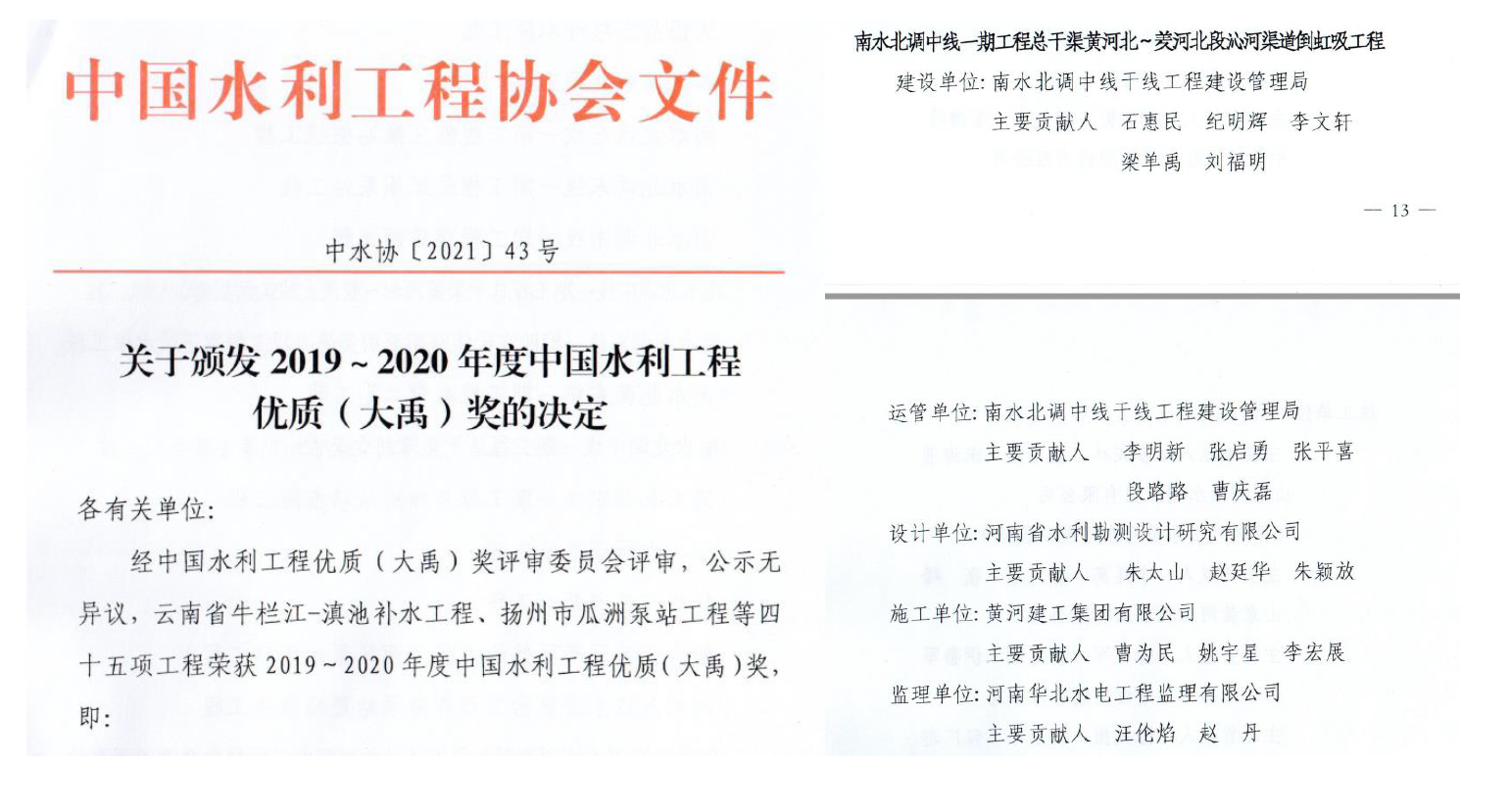 近日,中國(guó)水利工程優(yōu)質(zhì)(大禹)獎(jiǎng)評(píng)選結(jié)果揭曉,由豫水設(shè)計(jì)公司擔(dān)綱設(shè)計(jì)的南水北調(diào)中線一期工程總干渠黃河北~羑河北段沁河渠道倒虹吸工程,憑借科學(xué)設(shè)計(jì)和精良施工,榮獲2019年~2020年度中國(guó)水利工程優(yōu)質(zhì)(大禹)獎(jiǎng)。