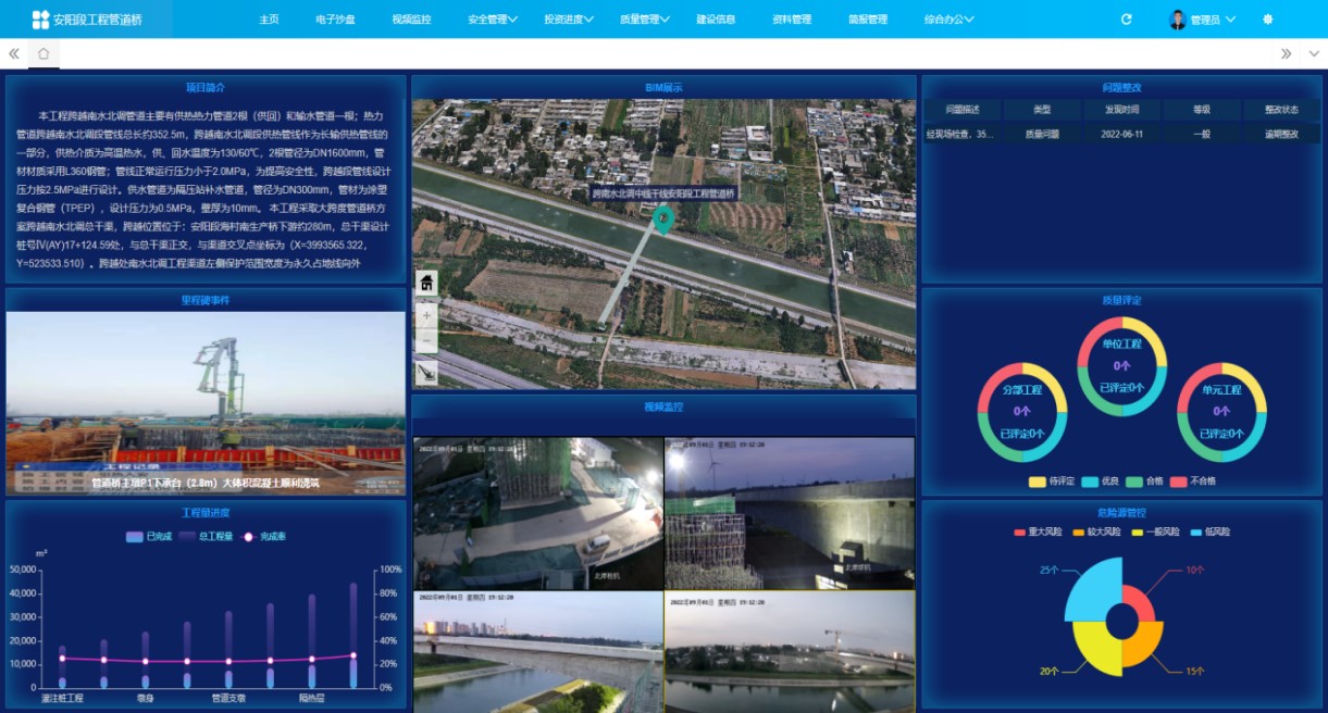 豫水設(shè)計(jì)公司工程管理院負(fù)責(zé)項(xiàng)目管理工作,把重心放在項(xiàng)目策劃和實(shí)施階段,集中力量分析管道橋工程實(shí)施的難點(diǎn)、工程風(fēng)險(xiǎn)、疫情防控壓力等,科學(xué)合理的制定管理計(jì)劃,充分發(fā)揮南水北調(diào)中線總干渠工程主設(shè)單位的技術(shù)優(yōu)勢,開發(fā)了基于BIM和大數(shù)據(jù)技術(shù)的項(xiàng)目信息化管理平臺,建立了工程三維虛擬模型,融合現(xiàn)場各維度的管理數(shù)據(jù),為管理決策提供實(shí)時(shí)、便捷、高效的信息化技術(shù)支撐。