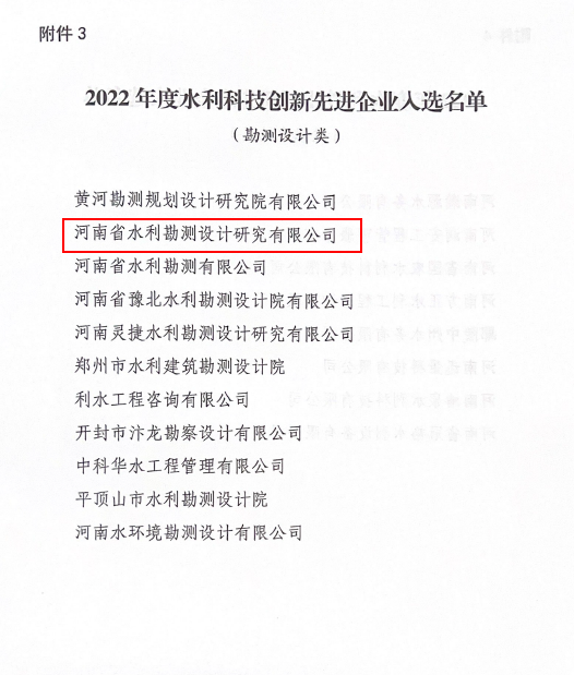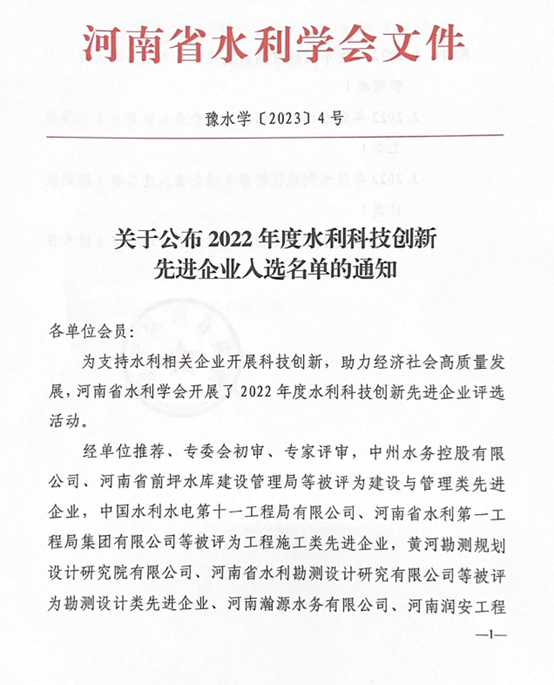 為支持水利企業(yè)開展科技創(chuàng)新,助力經(jīng)濟社會高質(zhì)量發(fā)展,河南省水利學(xué)會自2022年11月開展了2022年度水利科技創(chuàng)新先進企業(yè)評選活動。經(jīng)激烈角逐,共有11家企業(yè)入選,豫水設(shè)計公司被評為“勘測設(shè)計先進企業(yè)”。