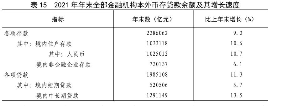 全年社會融資規(guī)模增量31.4萬億元,按可比口徑計算,比上年少3.4萬億元。年末社會融資規(guī)模存量314.1萬億元,按可比口徑計算,比上年末增長10.3%,其中對實體經濟發(fā)放的人民幣貸款余額191.5萬億元,增長11.6%。年末全部金融機構本外幣各項存款余額238.6萬億元,比年初增加20.2萬億元,其中人民幣各項存款余額232.3萬億元,增加19.7萬億元。全部金融機構本外幣各項貸款余額198.5萬億元,增加20.1萬億元,其中人民幣各項貸款余額192.7萬億元,增加19.9萬億元。人民幣普惠金融貸款余額26.5萬億元,增加5.0萬億元。