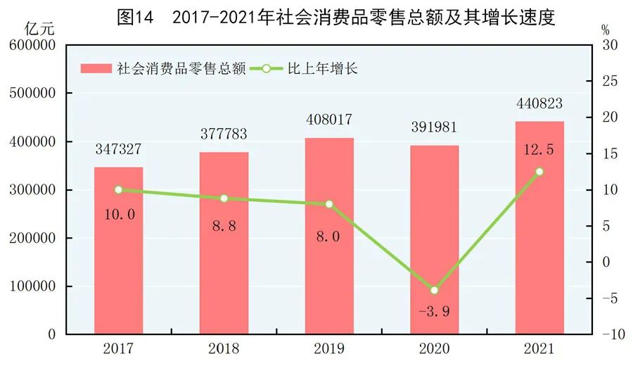 全年社會消費品零售總額440823億元,比上年增長12.5%。按經營地統(tǒng)計,城鎮(zhèn)消費品零售額381558億元,增長12.5%;鄉(xiāng)村消費品零售額59265億元,增長12.1%。按消費類型統(tǒng)計,商品零售額393928億元,增長11.8%;餐飲收入額46895億元,增長18.6%。