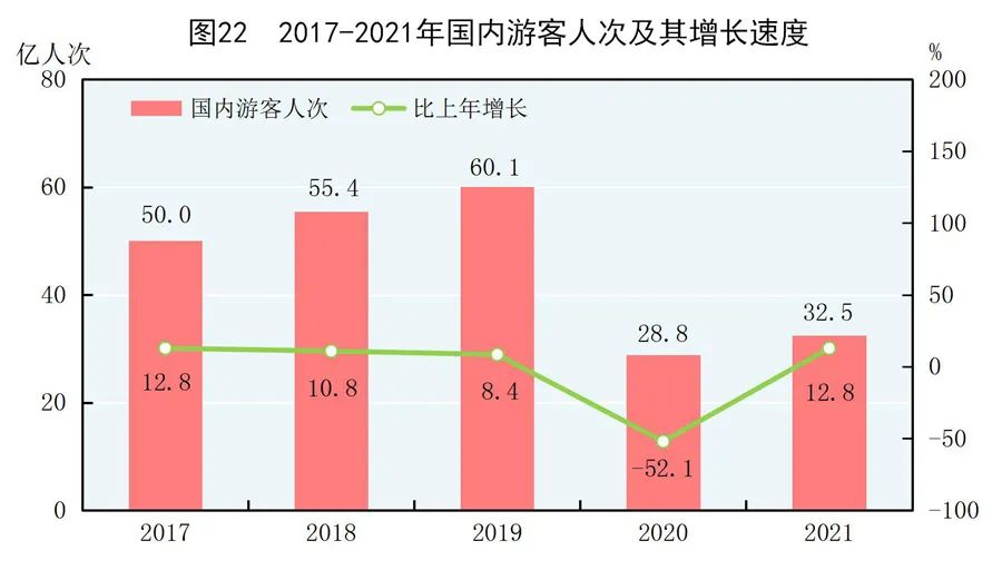 全年國內游客32.5億人次,比上年增長12.8%。其中,城鎮(zhèn)居民游客23.4億人次,增長13.4%;農村居民游客9.0億人次,增長11.1%。國內旅游收入29191億元,增長31.0%。其中,城鎮(zhèn)居民游客花費23644億元,增長31.6%;農村居民游客花費5547億元,增長28.4%。