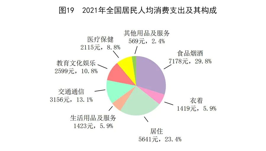 全年全國居民人均消費支出24100元,比上年增長13.6%,扣除價格因素,實際增長12.6%。其中,人均服務性消費支出10645元,比上年增長17.8%,占居民人均消費支出的比重為44.2%。按常住地分,城鎮(zhèn)居民人均消費支出30307元,增長12.2%,扣除價格因素,實際增長11.1%;農村居民人均消費支出15916元,增長16.1%,扣除價格因素,實際增長15.3%。全國居民恩格爾系數為29.8%,其中城鎮(zhèn)為28.6%,農村為32.7%。