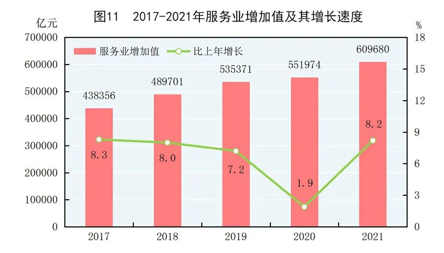 全年批發(fā)和零售業(yè)增加值110493億元,比上年增長11.3%;交通運輸、倉儲和郵政業(yè)增加值47061億元,增長12.1%;住宿和餐飲業(yè)增加值17853億元,增長14.5%;金融業(yè)增加值91206億元,增長4.8%;房地產業(yè)增加值77561億元,增長5.2%;信息傳輸、軟件和信息技術服務業(yè)增加值43956億元,增長17.2%;租賃和商務服務業(yè)增加值35350億元,增長6.2%。全年規(guī)模以上服務業(yè)企業(yè)營業(yè)收入比上年增長18.7%,利潤總額增長13.4%。