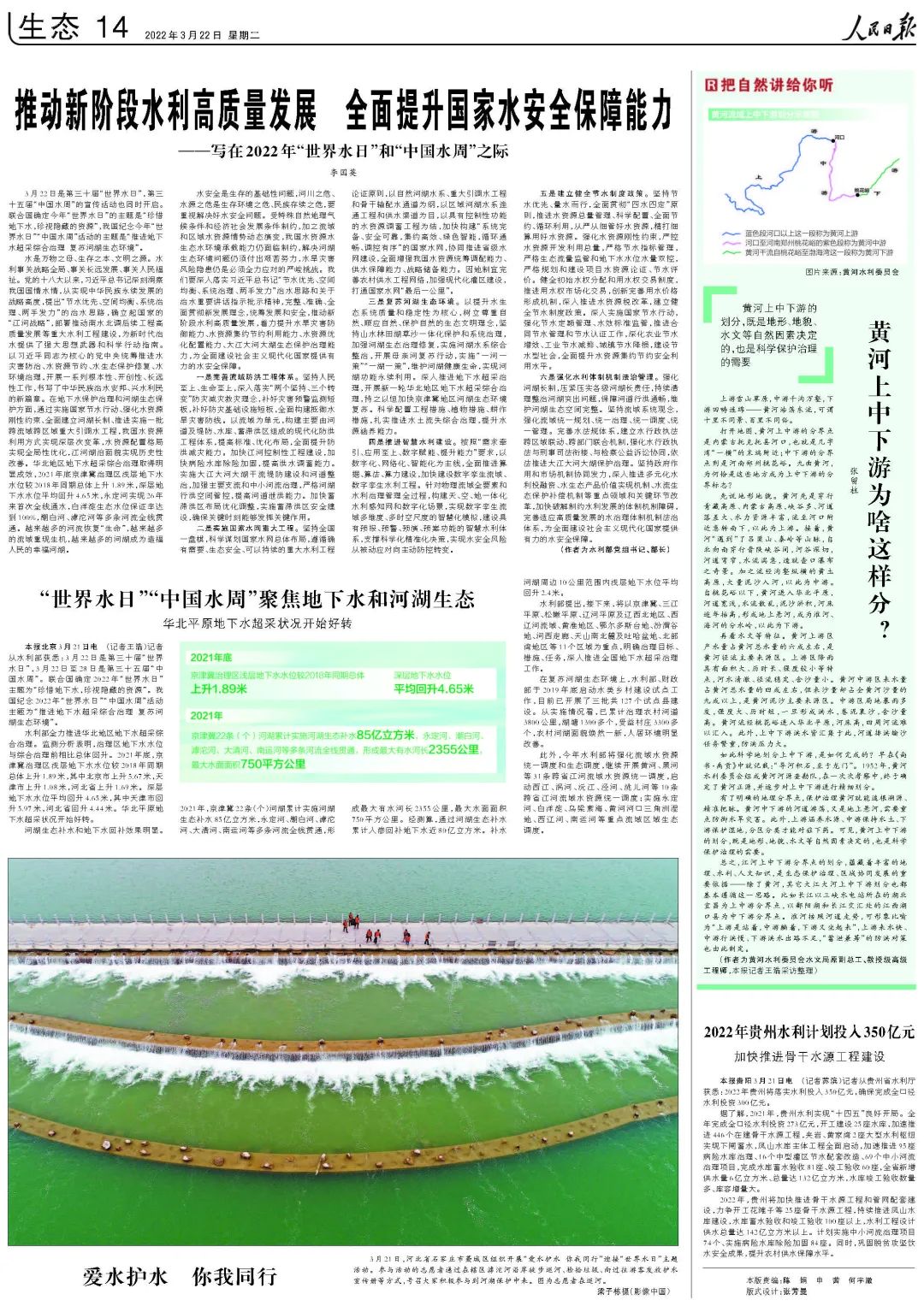 3月22日是第三十屆“世界水日”,第三十五屆“中國水周”的宣傳活動也同時開啟。聯(lián)合國確定今年“世界水日”的主題是“珍惜地下水,珍視隱藏的資源”,我國紀念今年“世界水日”“中國水周”活動的主題是“推進地下水超采綜合治理復蘇河湖生態(tài)環(huán)境”。
