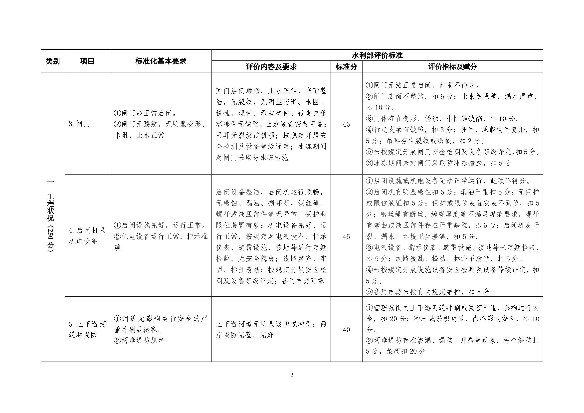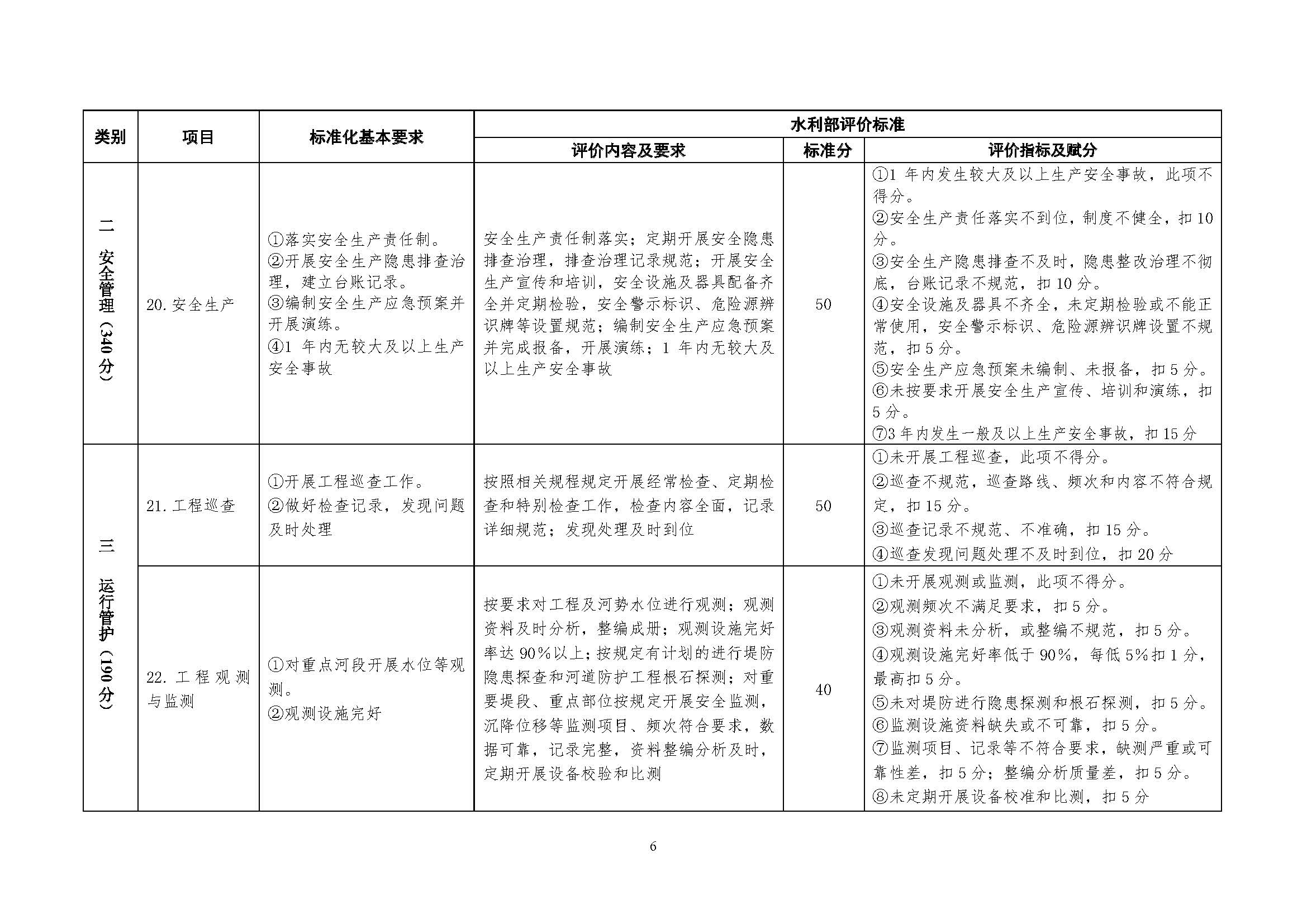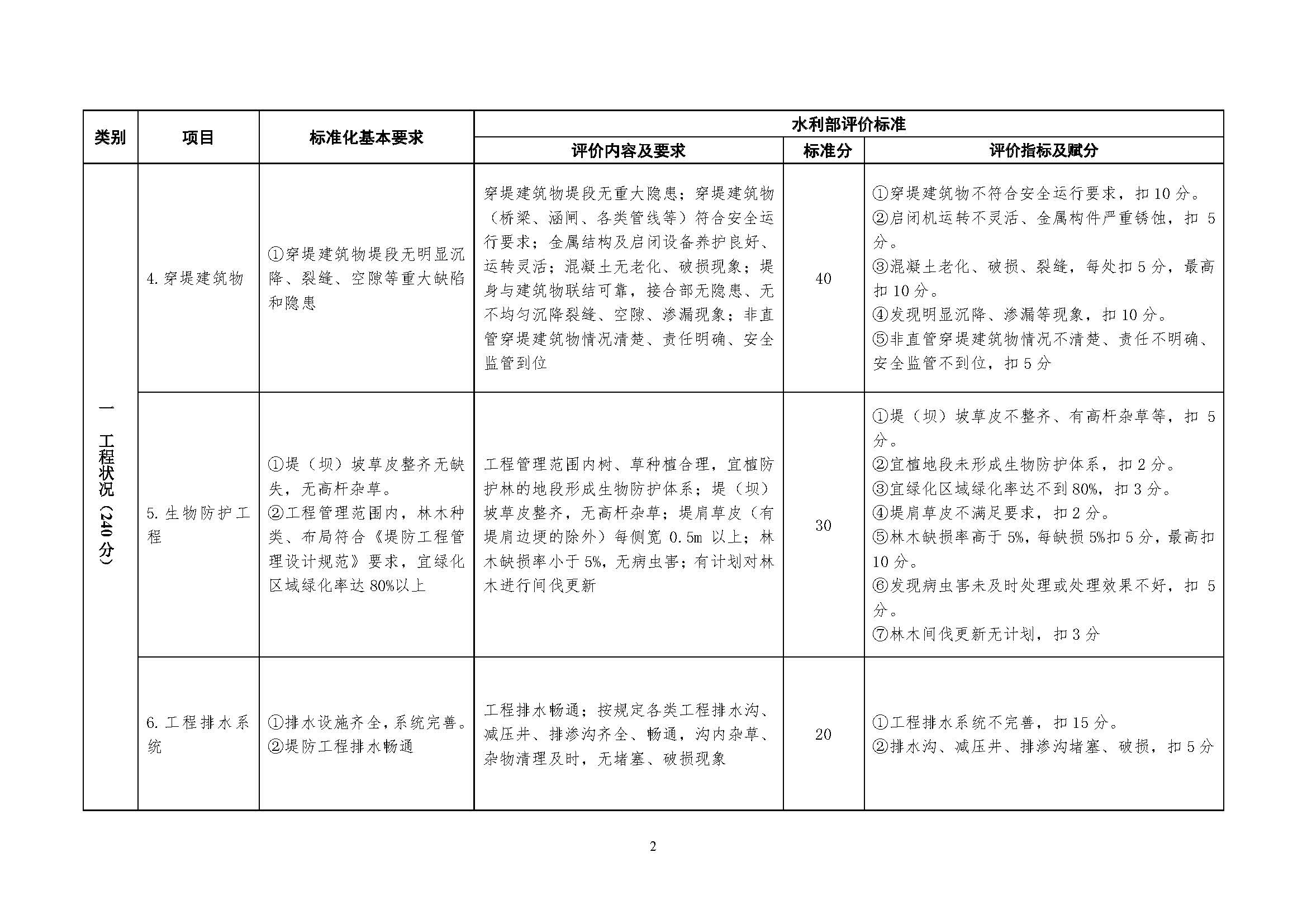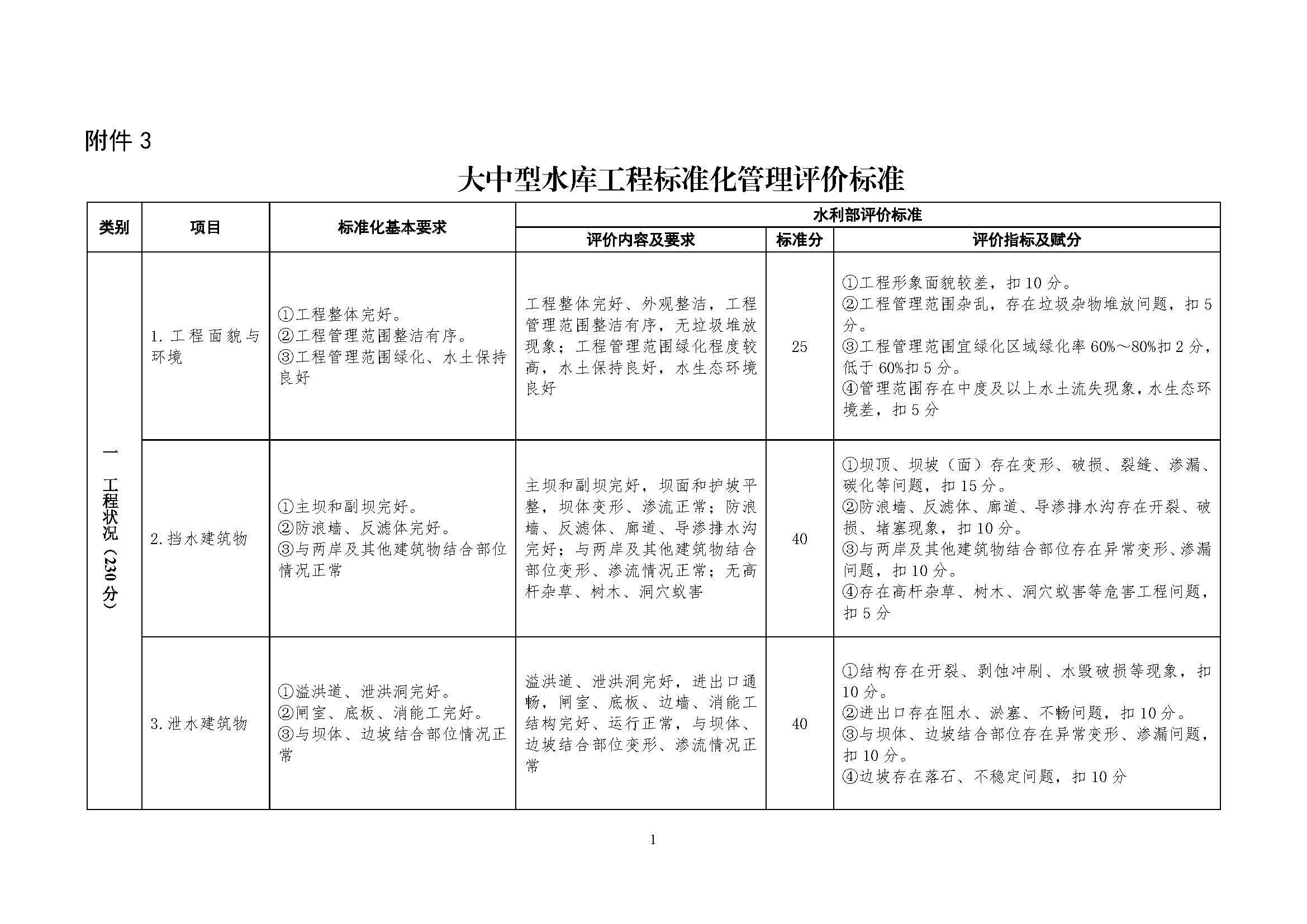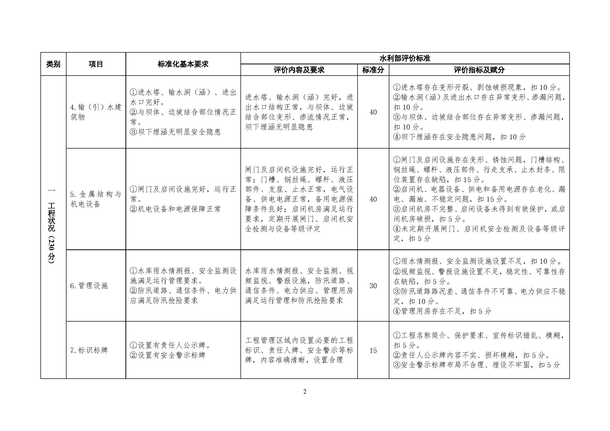 與《指導意見》相配套,同時印發(fā)了《評價辦法》及其評價標準,對標準化評價的適用范圍、評價主體、評價程序等作出規(guī)定,包括大中型水庫、大中型水閘、3級以上堤防評價標準。