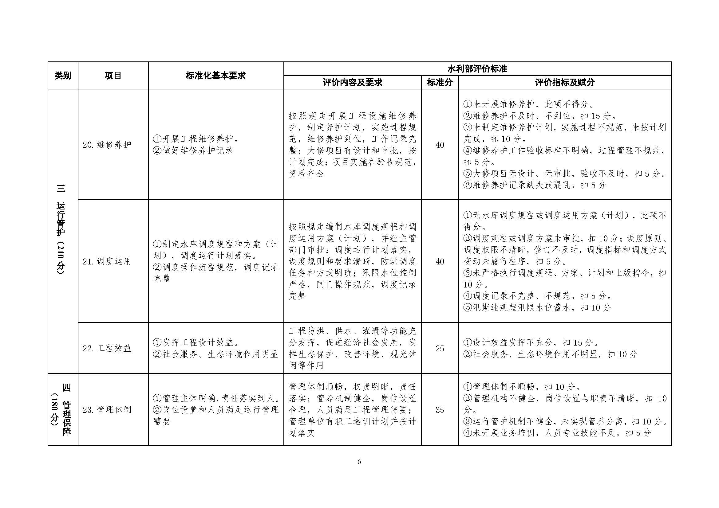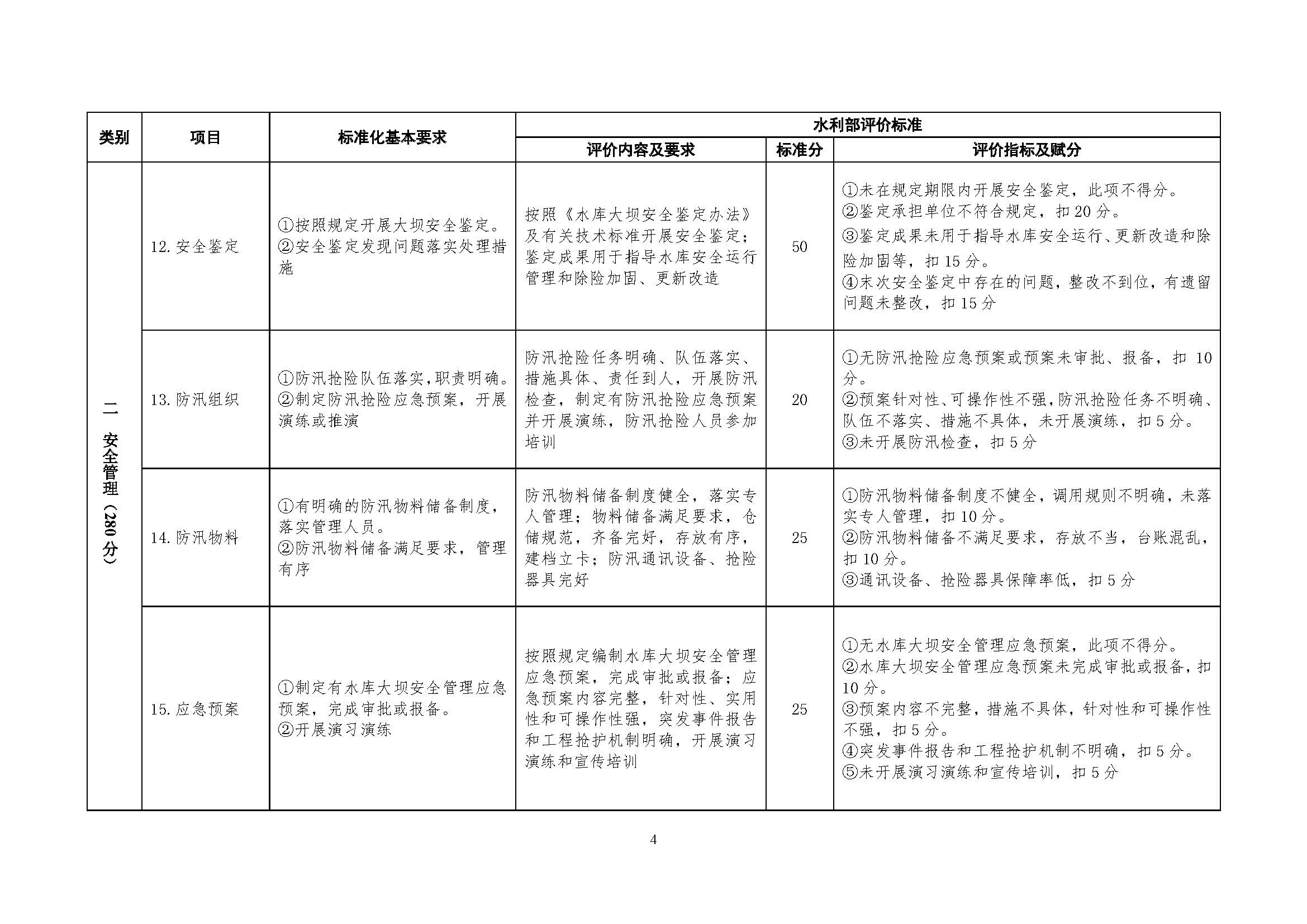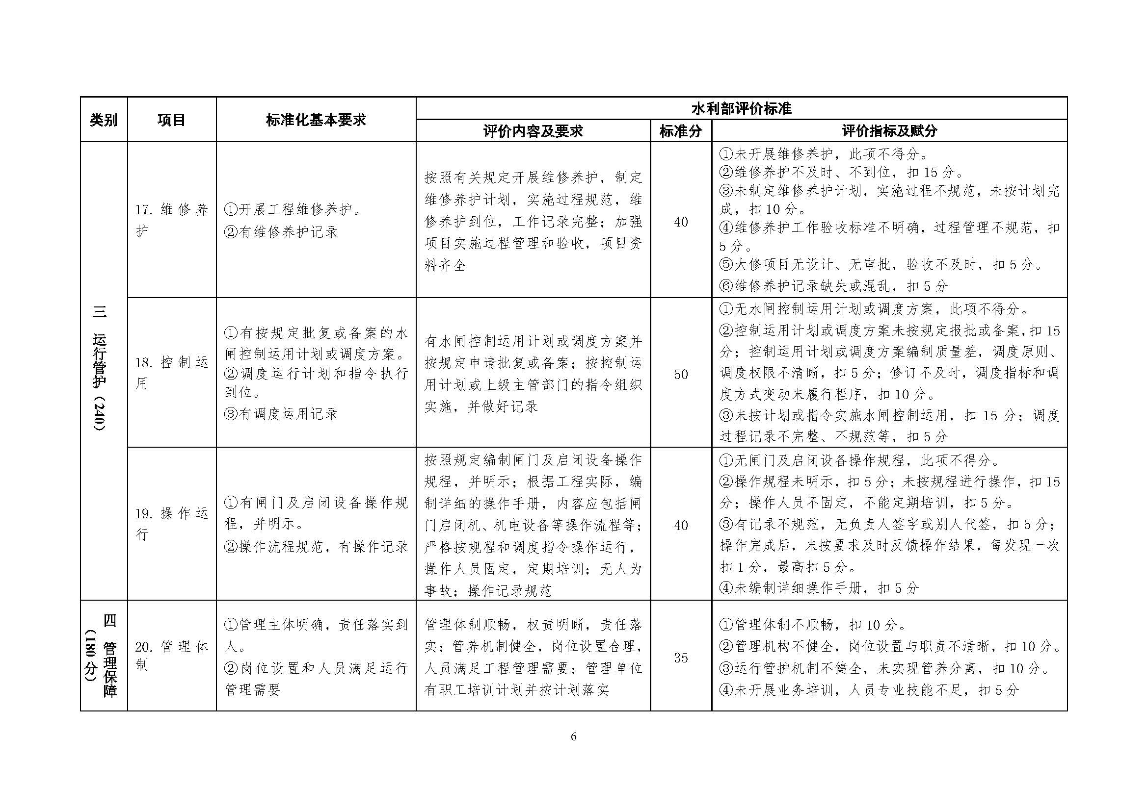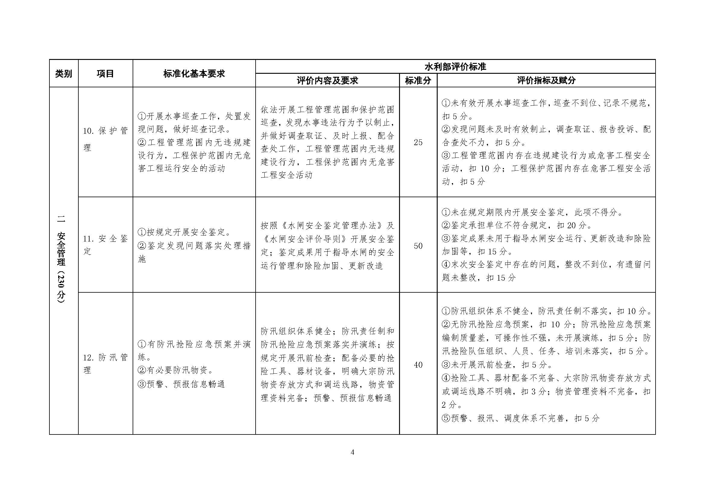 與《指導意見》相配套,同時印發(fā)了《評價辦法》及其評價標準,對標準化評價的適用范圍、評價主體、評價程序等作出規(guī)定,包括大中型水庫、大中型水閘、3級以上堤防評價標準。