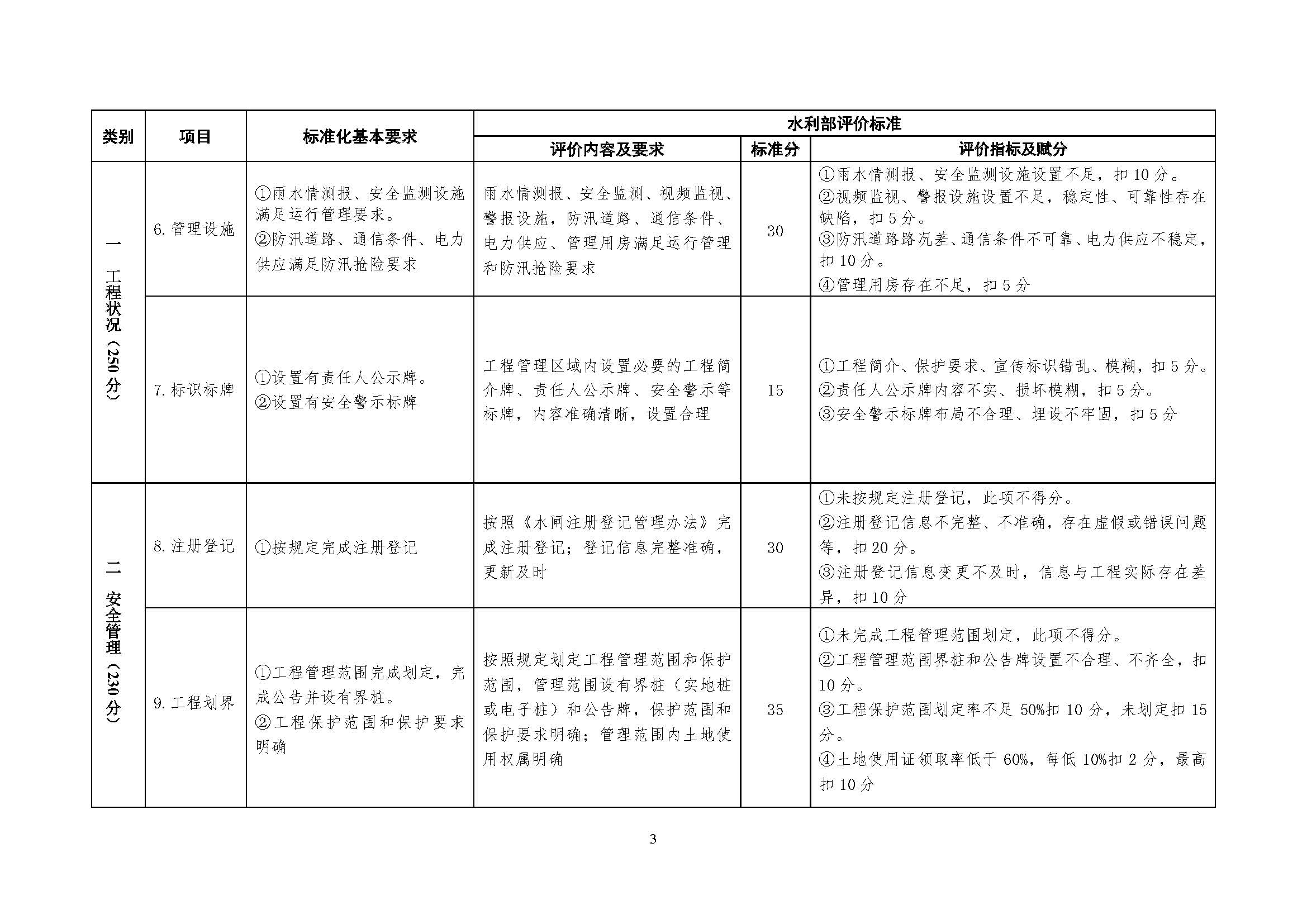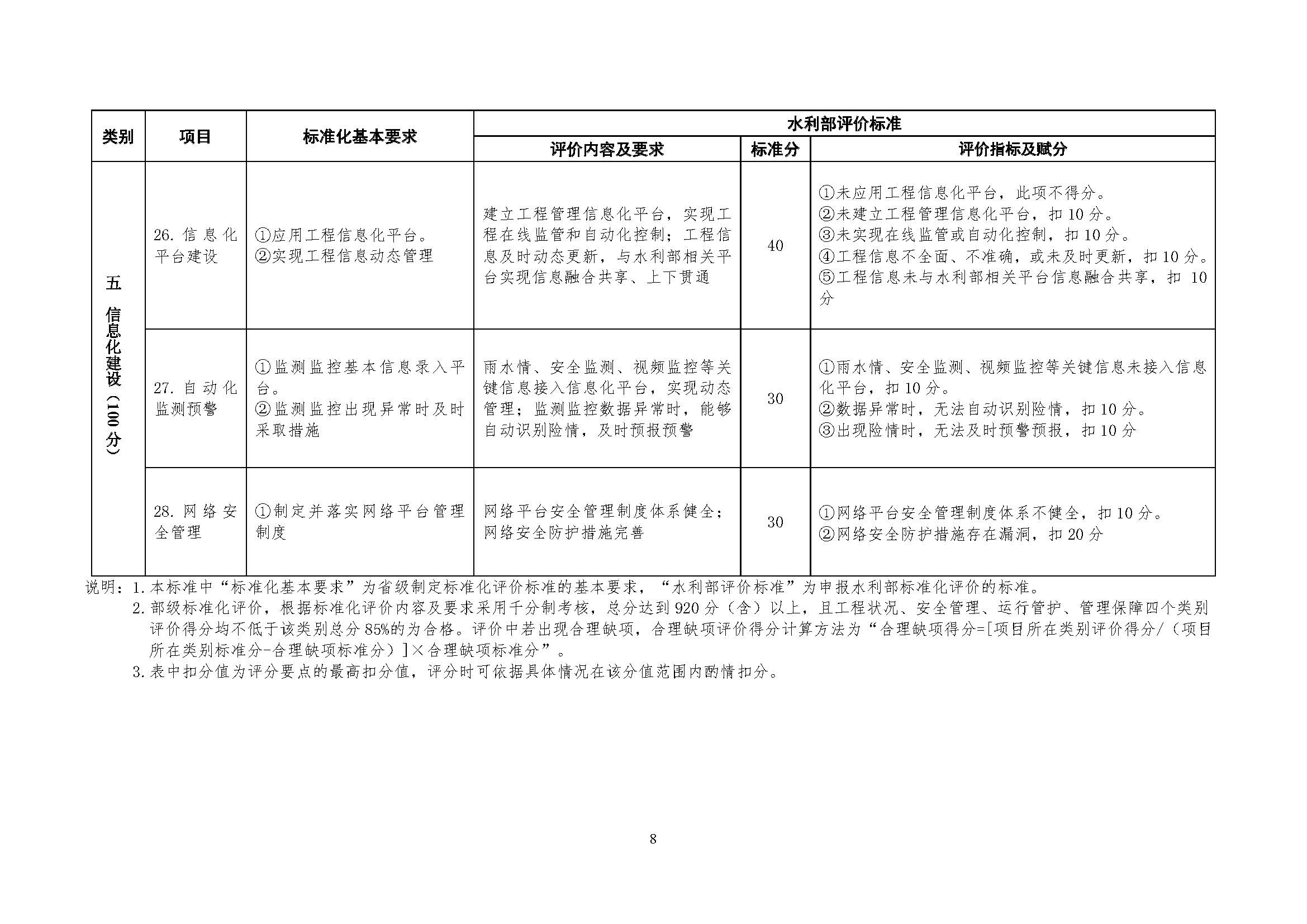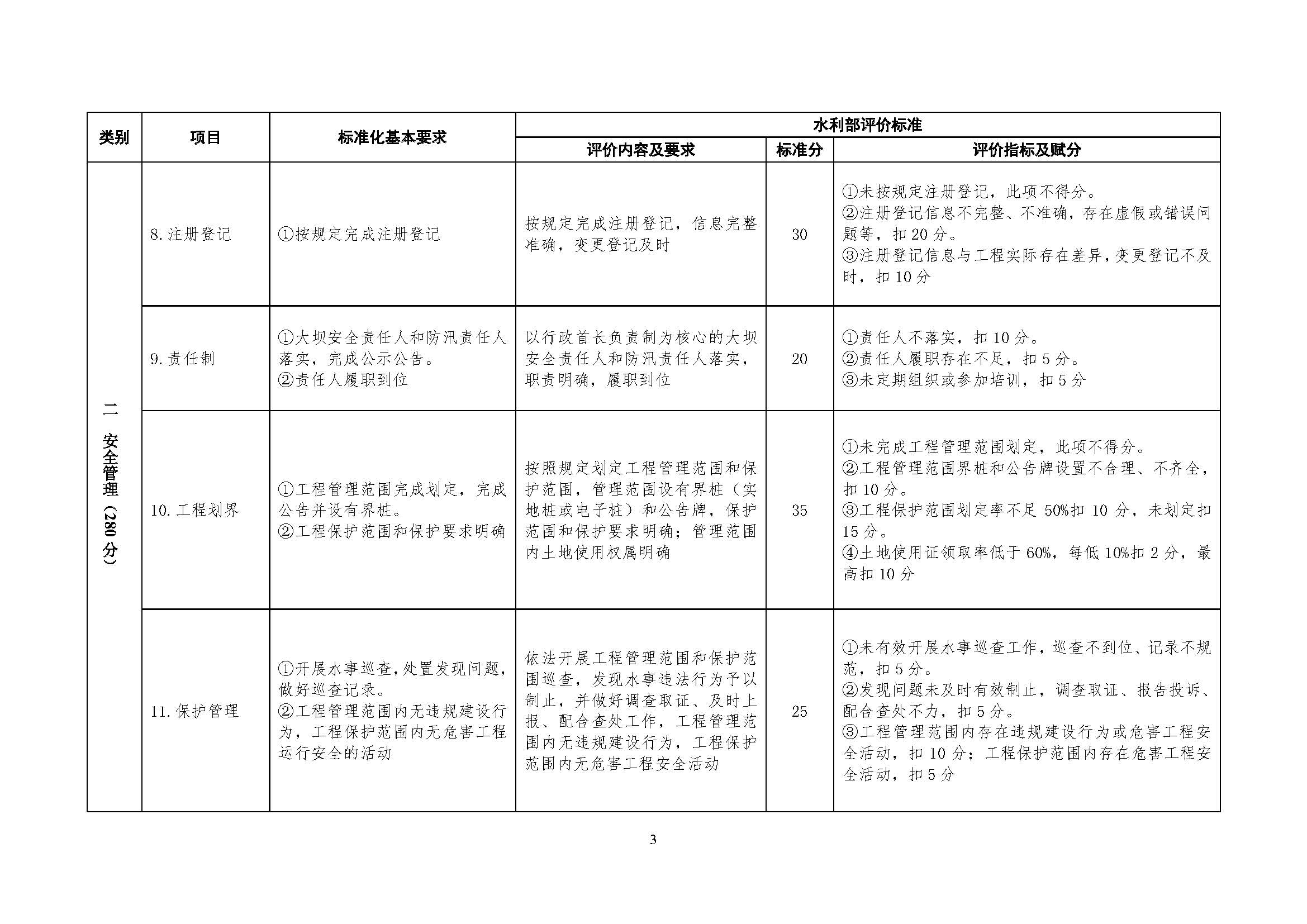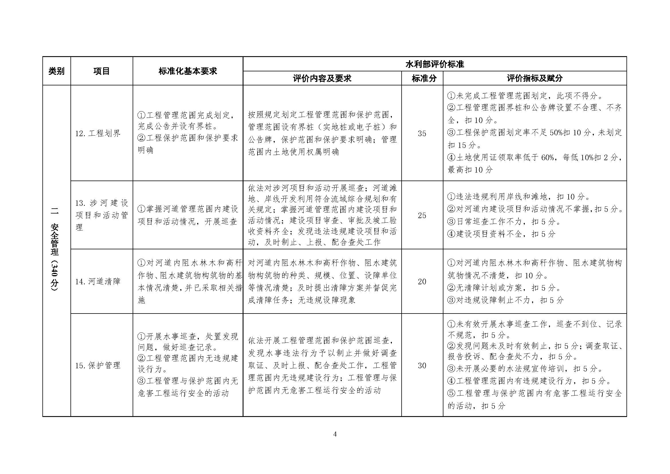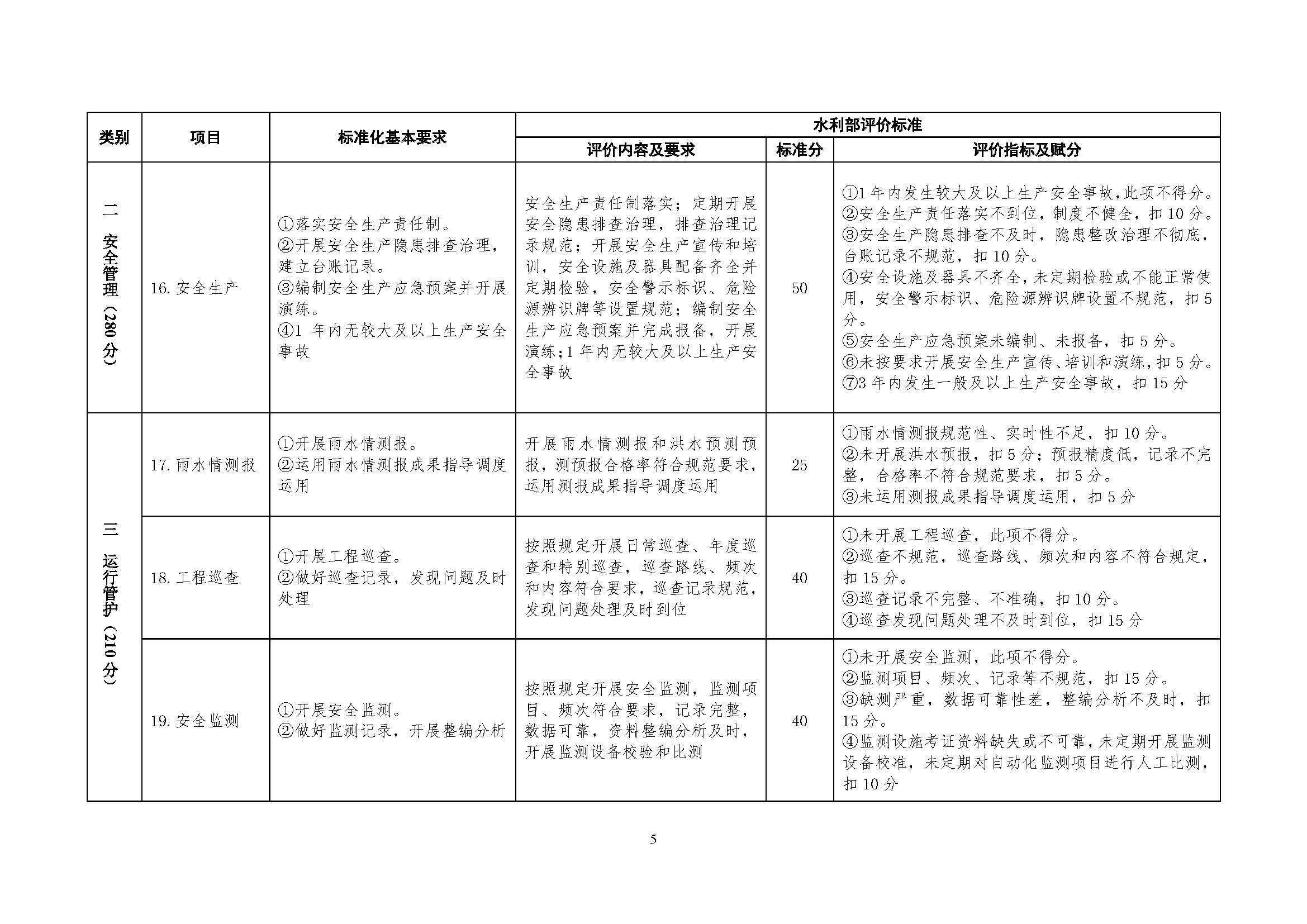 與《指導意見》相配套,同時印發(fā)了《評價辦法》及其評價標準,對標準化評價的適用范圍、評價主體、評價程序等作出規(guī)定,包括大中型水庫、大中型水閘、3級以上堤防評價標準。