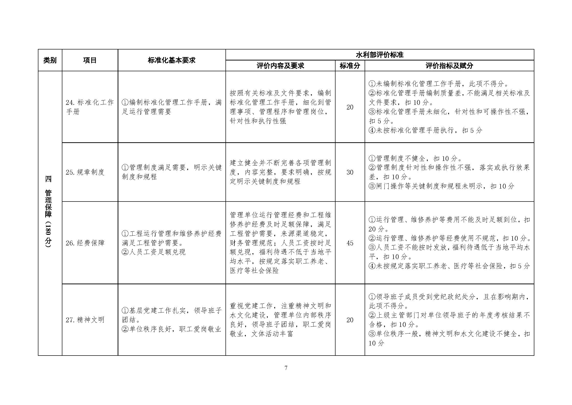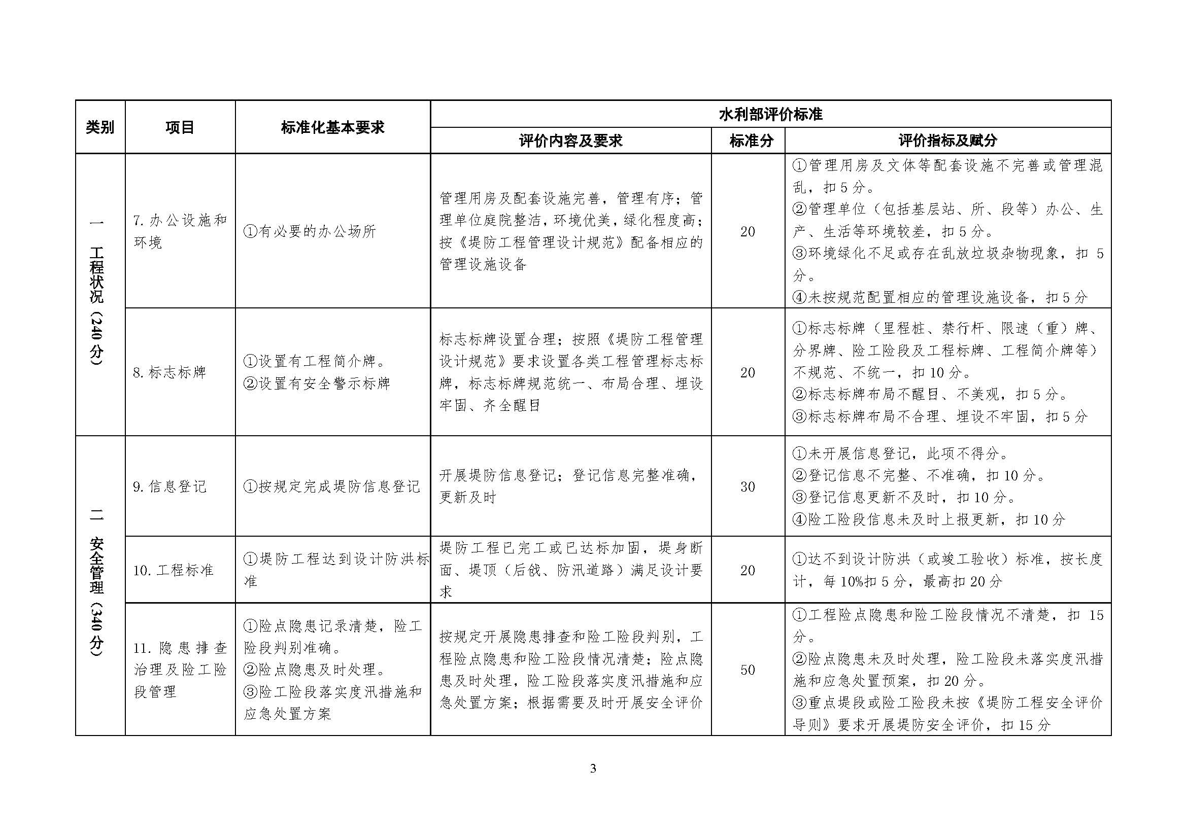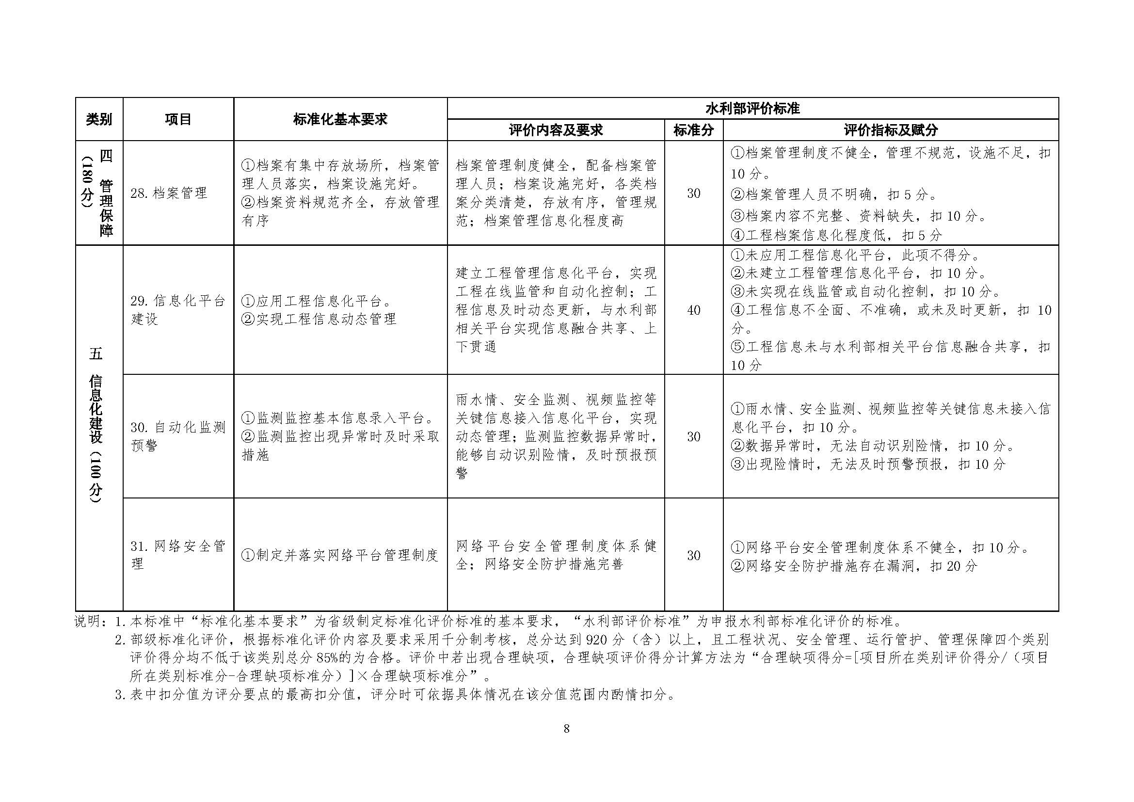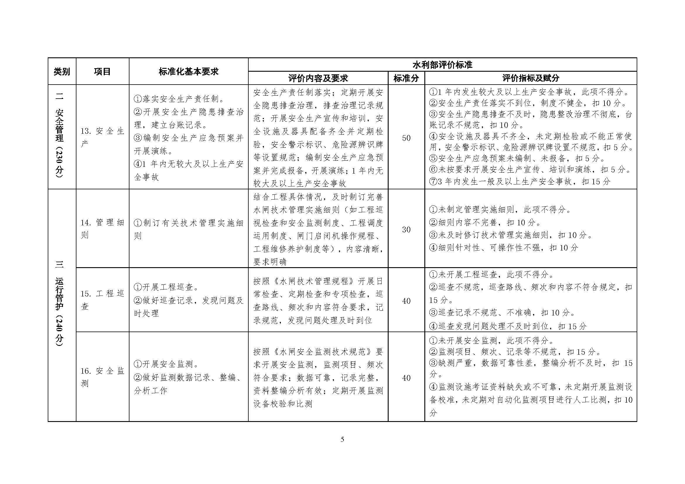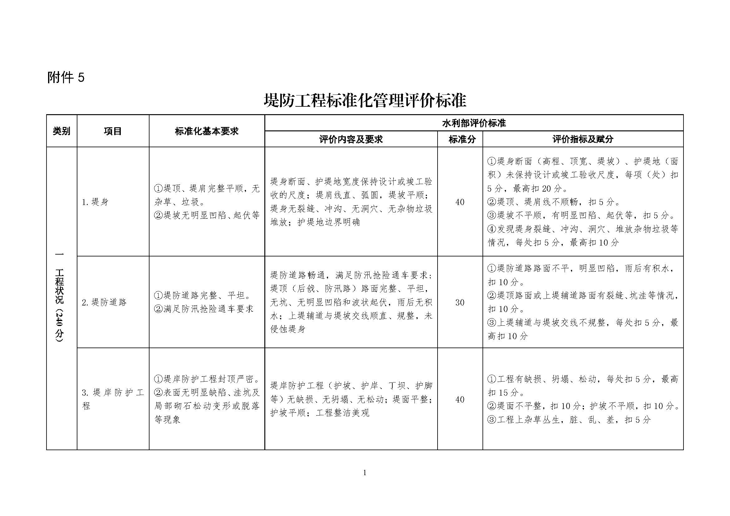 與《指導意見》相配套,同時印發(fā)了《評價辦法》及其評價標準,對標準化評價的適用范圍、評價主體、評價程序等作出規(guī)定,包括大中型水庫、大中型水閘、3級以上堤防評價標準。