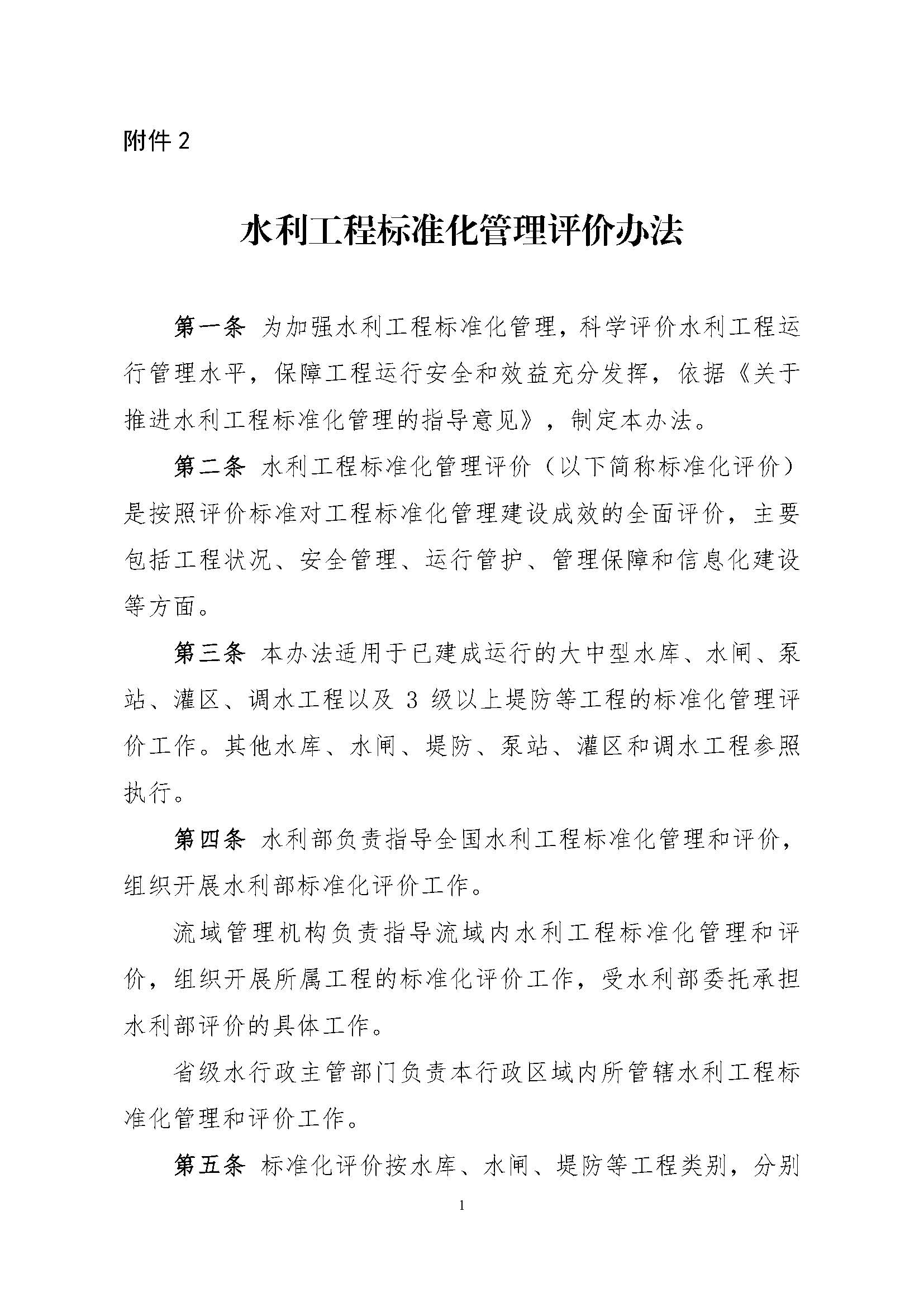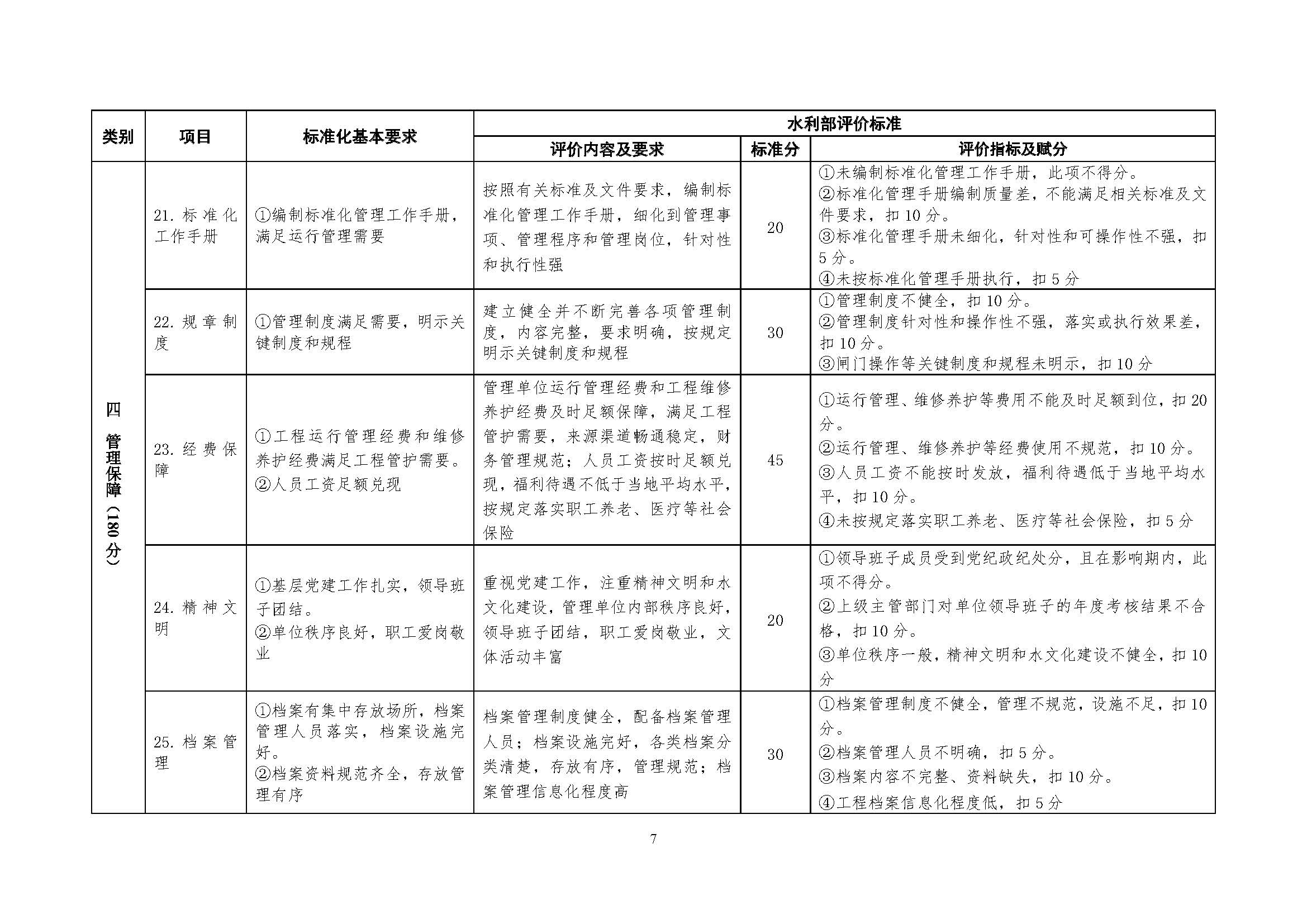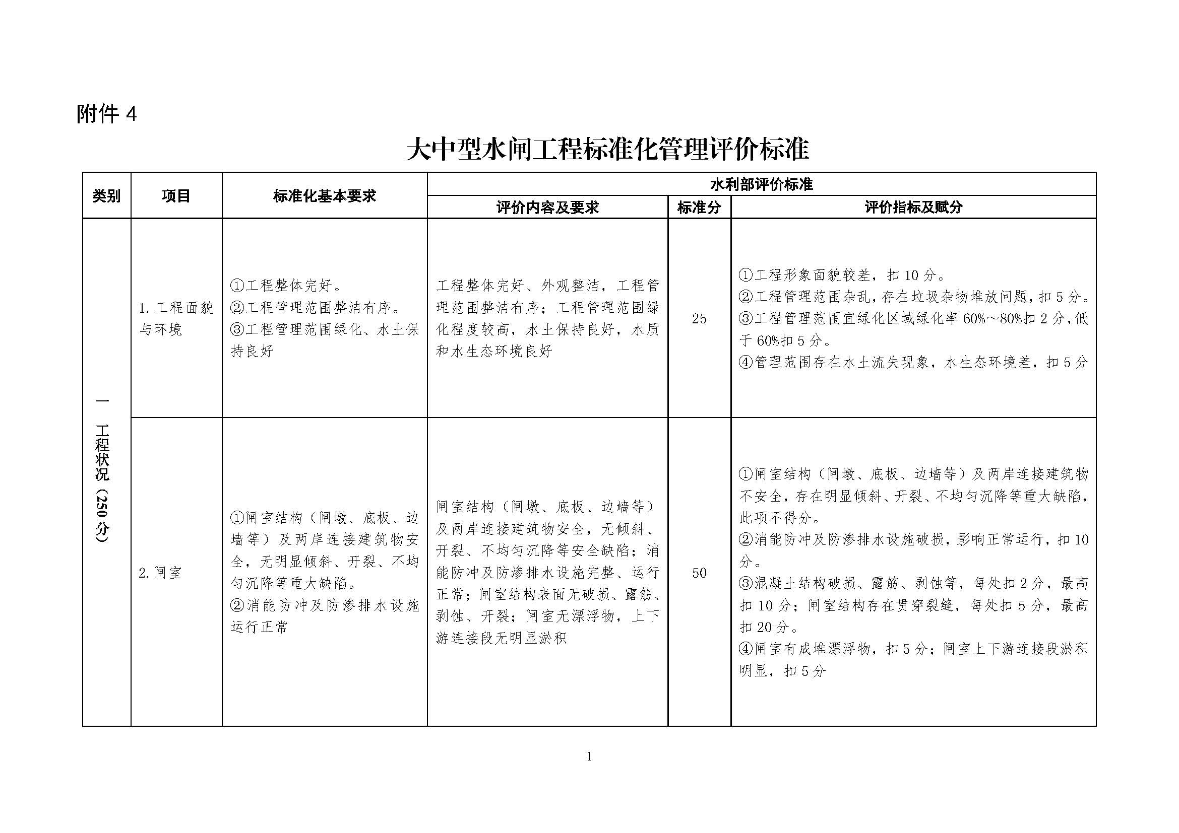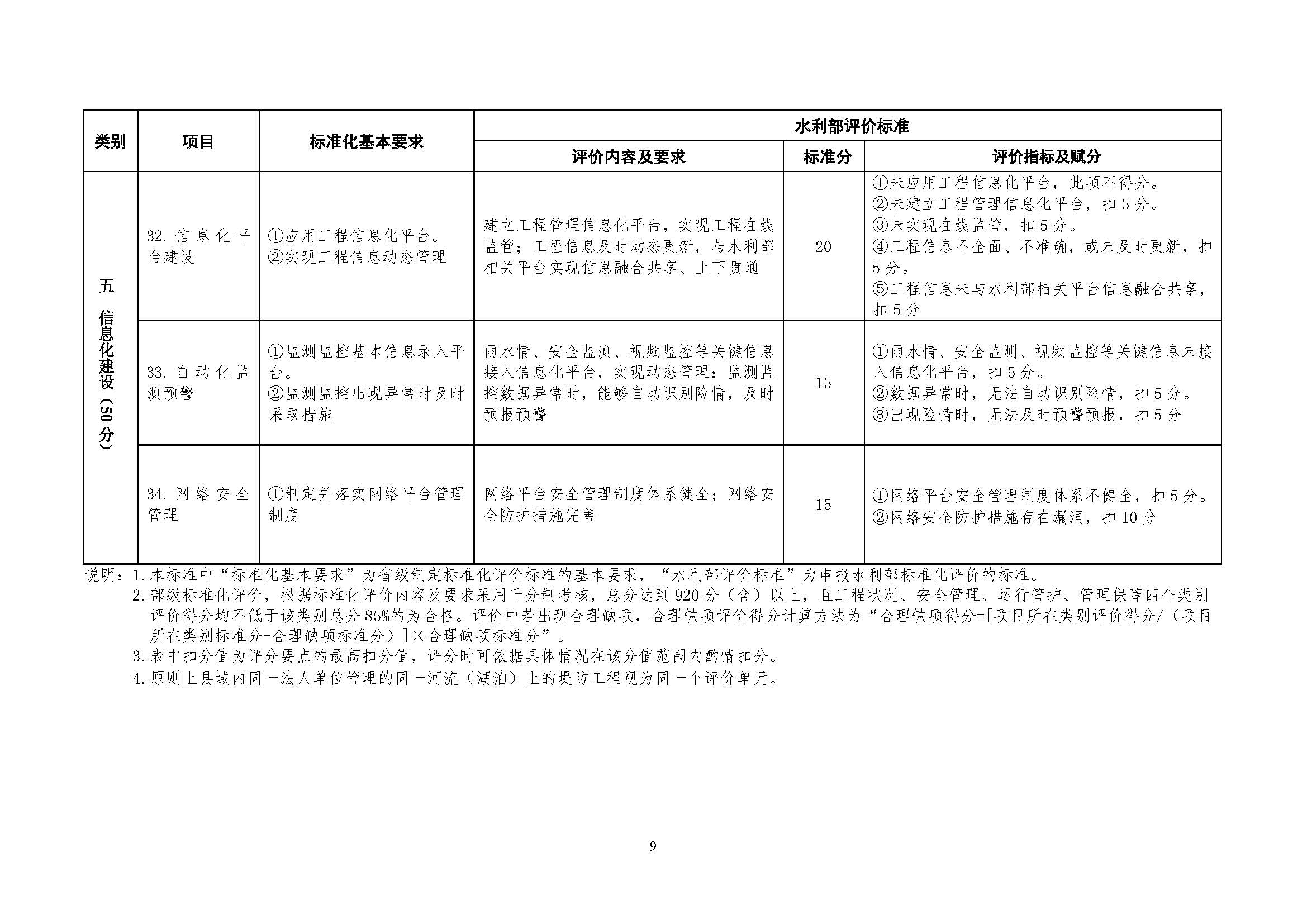 與《指導意見》相配套,同時印發(fā)了《評價辦法》及其評價標準,對標準化評價的適用范圍、評價主體、評價程序等作出規(guī)定,包括大中型水庫、大中型水閘、3級以上堤防評價標準。