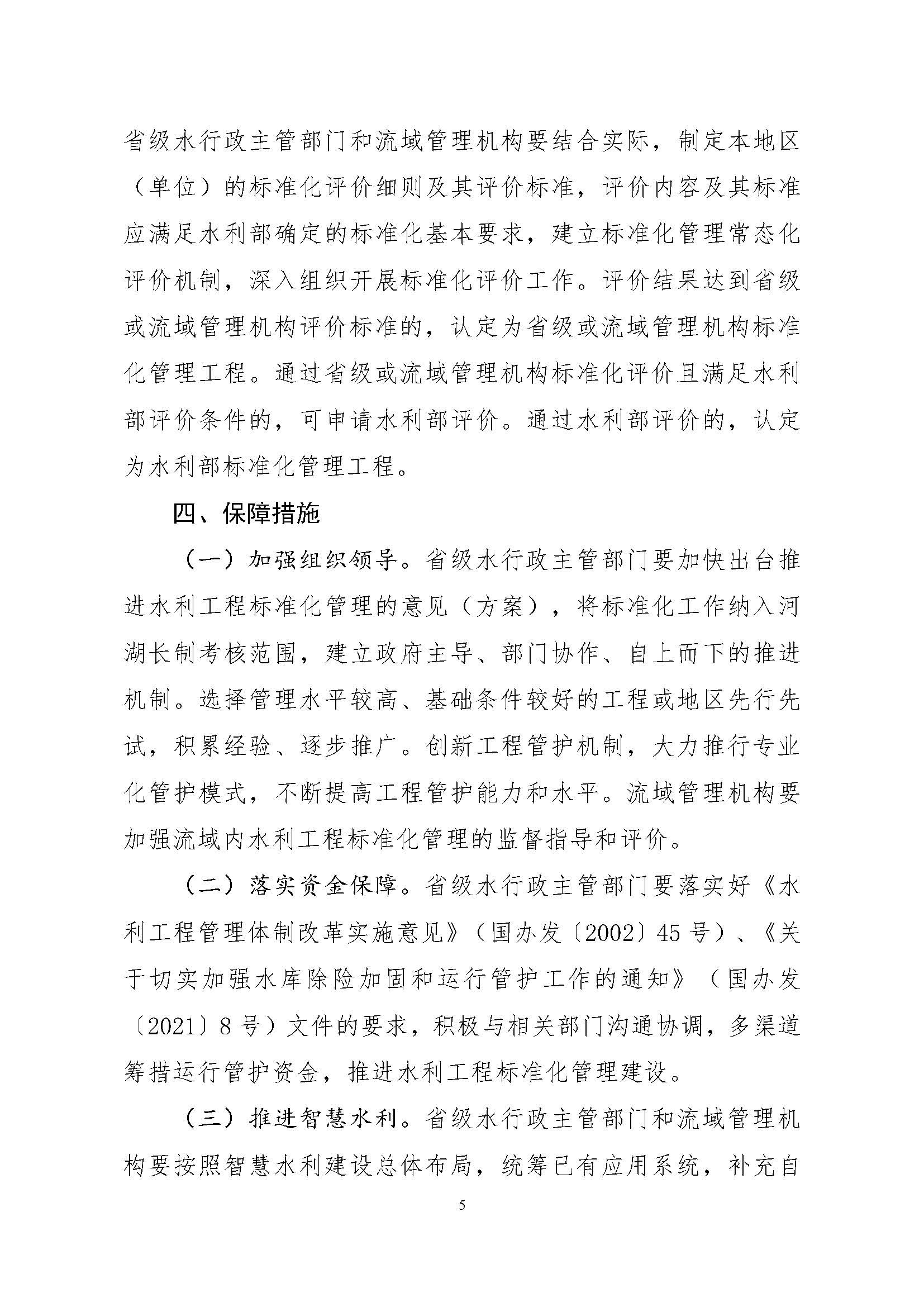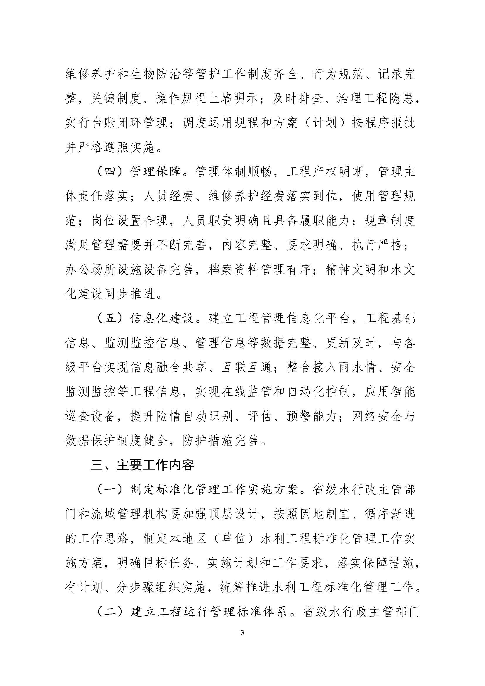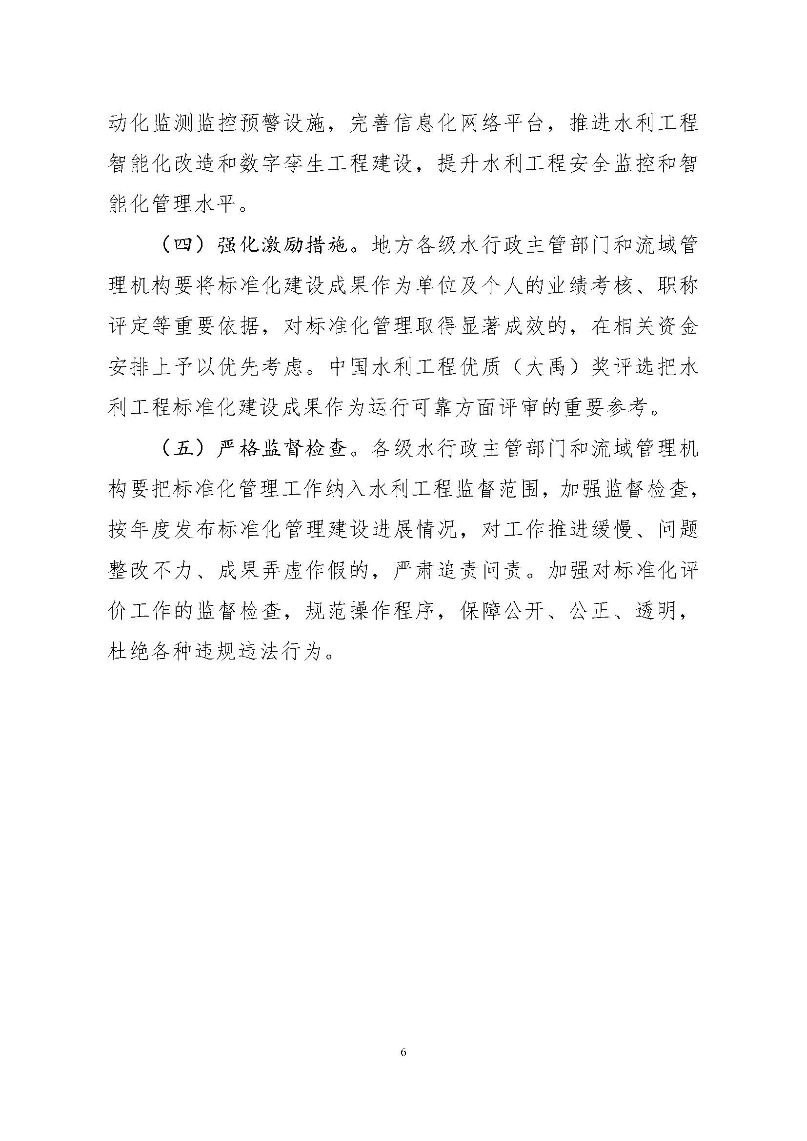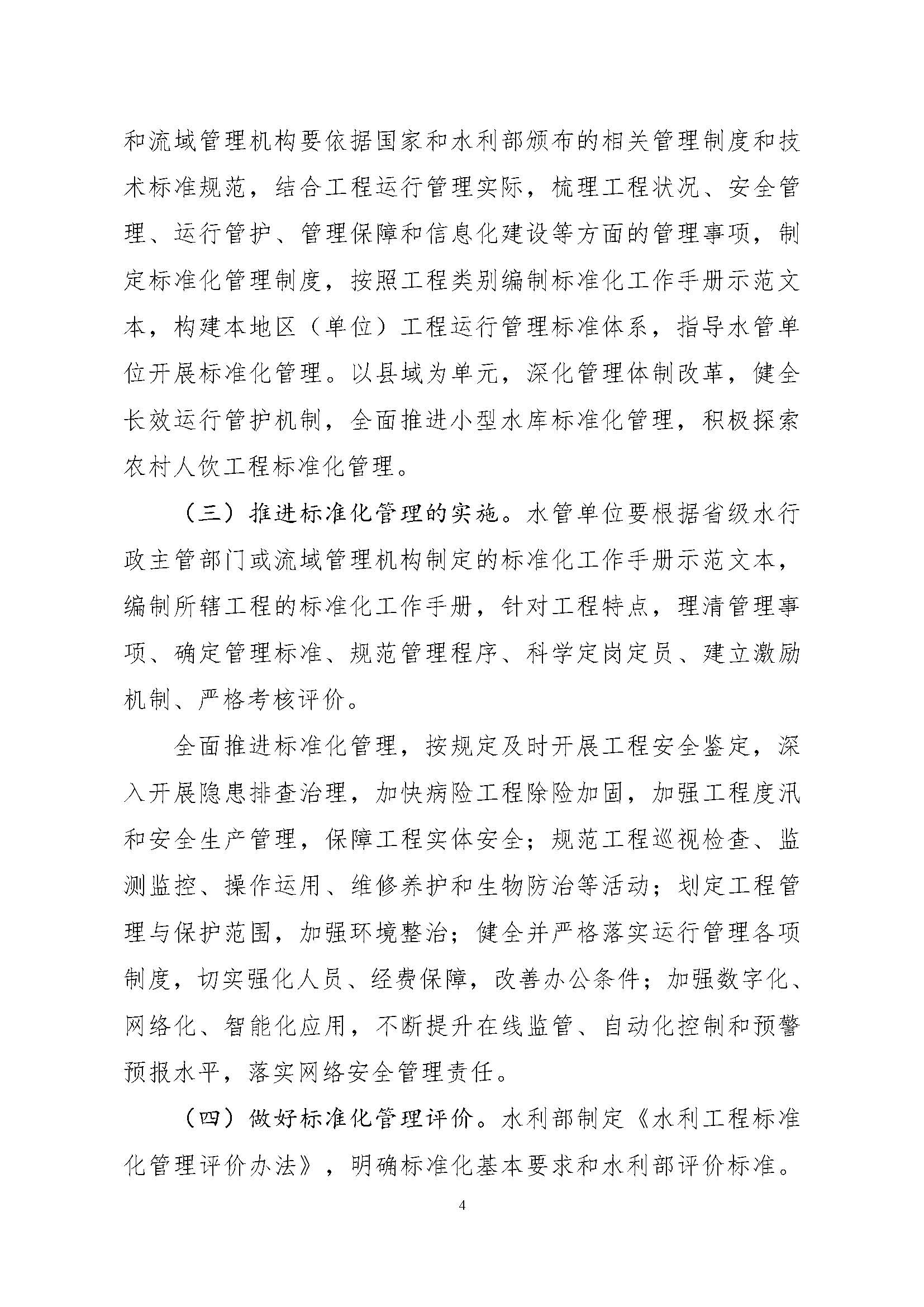 《指導意見》強調,要落實管理責任,規(guī)范管理行為,提高管理能力,在工程狀況、安全管理、運行管護、管理保障和信息化建設等5個方面滿足標準化管理要求?!吨笇б庖姟愤€確定了制定實施方案、建立運行管理標準體系、推進標準化管理的實施、做好標準化管理評價等工作步驟和具體內容,提出了保障措施。