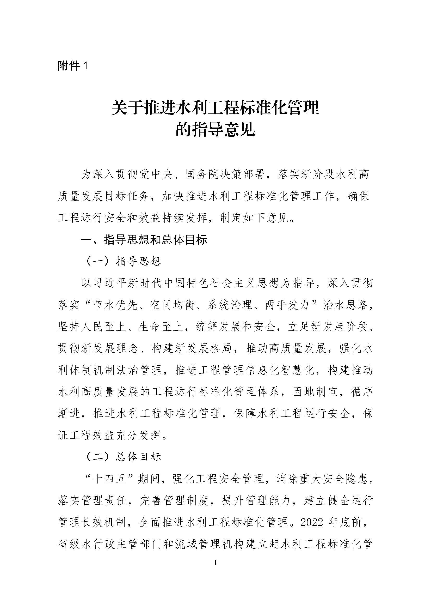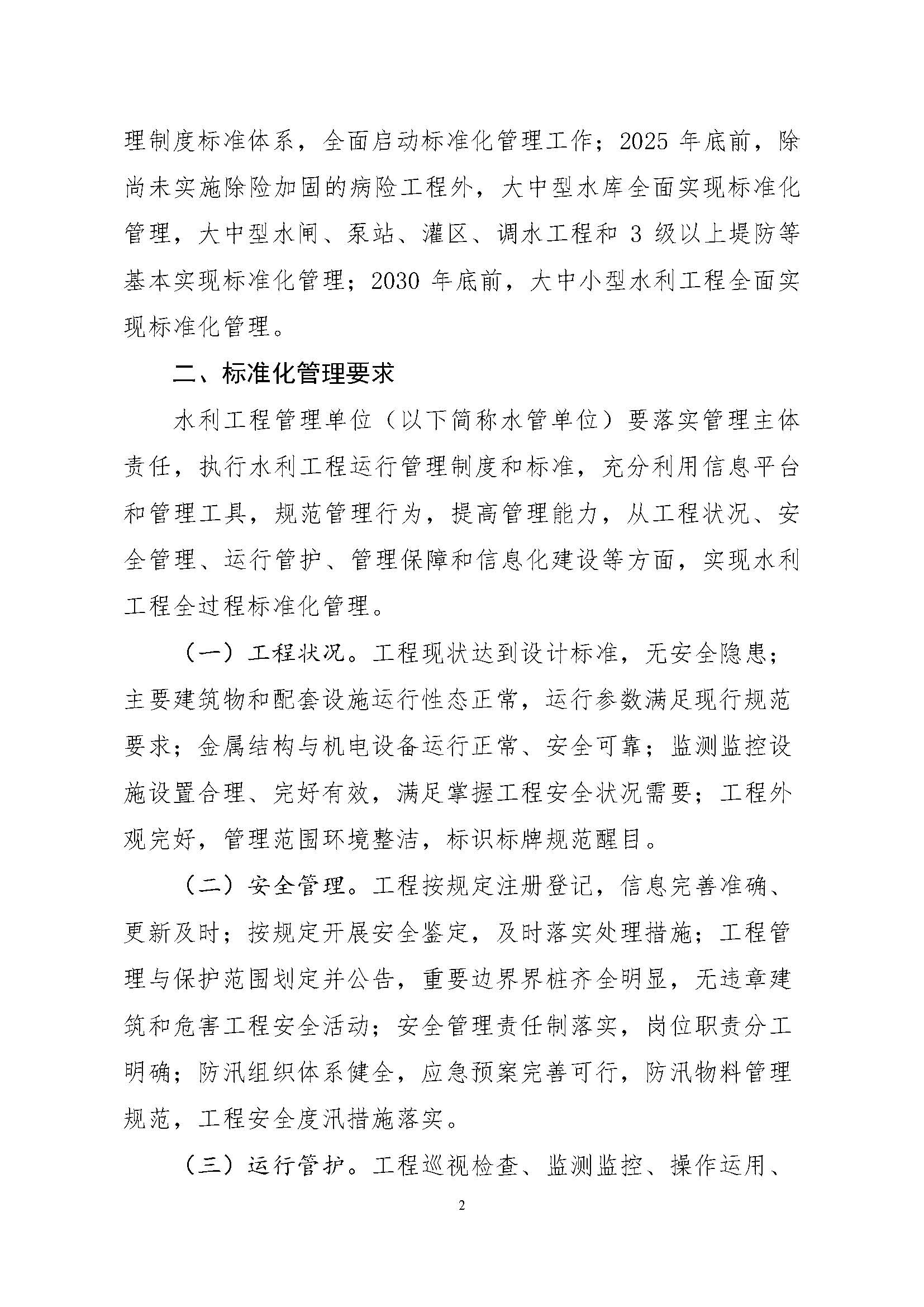 《指導意見》明確了推進水利工程標準化管理的指導思想和總體目標,要求2022年底前,省級水行政主管部門和流域管理機構建立起水利工程標準化管理制度標準體系,全面啟動標準化管理工作;2025年底前,除尚未實施除險加固的病險工程外,大中型水庫全面實現(xiàn)標準化管理,大中型水閘、泵站、灌區(qū)、調水工程和3級以上堤防等基本實現(xiàn)標準化管理;2030年底前,大中小型水利工程全面實現(xiàn)標準化管理。